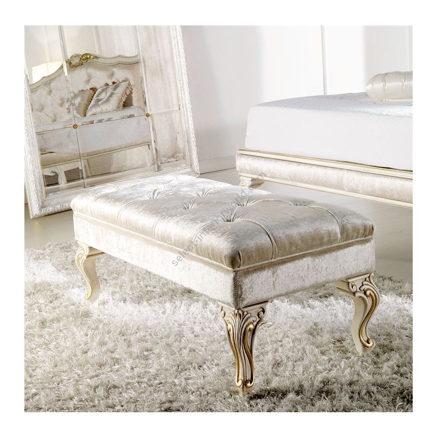 The structure is made of beech, whilst the upholstered headboard and frame are made of poplar multilayer. The orthopaedic metal mesh base is included in the price (mattress not included). The finish in gold leaf is not included in the price.