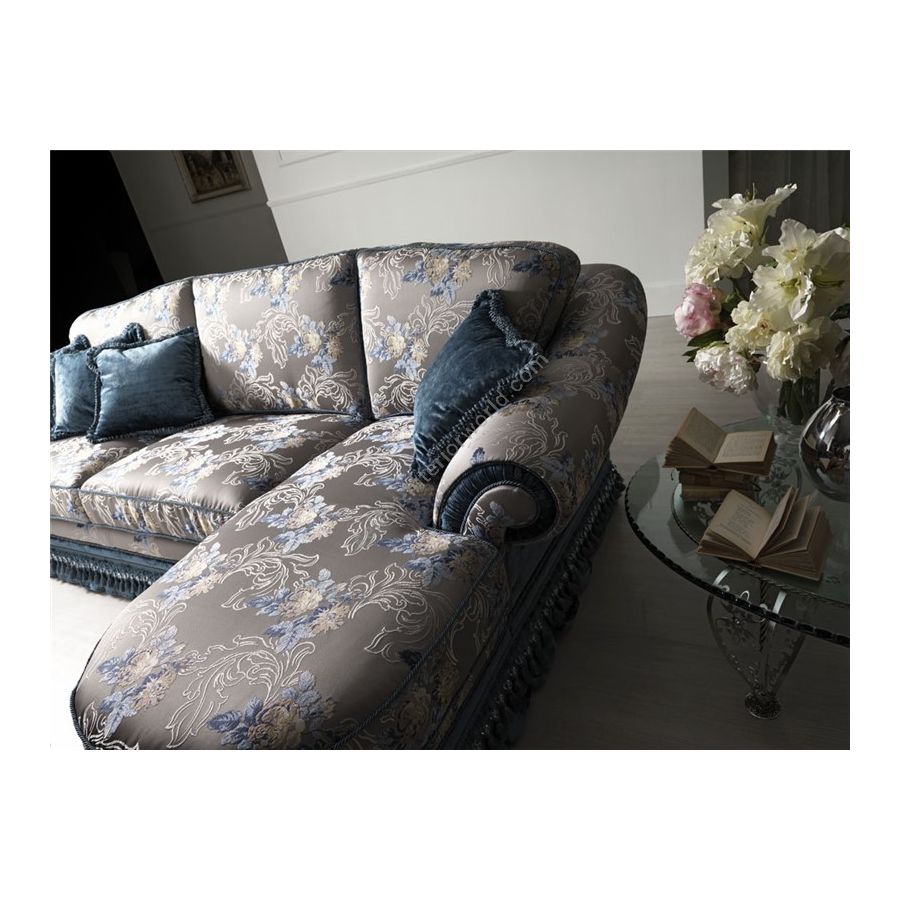 Its harmonious and pure line, free of any extrinsic complexities, where matching, the sinuous spirals and linear shapes are the result of the careful and thorough research that give it a unique and inimitable imprint. The original fabrics and colour matching embellish the Chaise Longue, like an opera where lyrics and melody are harmoniously mingled with counterpoints and effects.