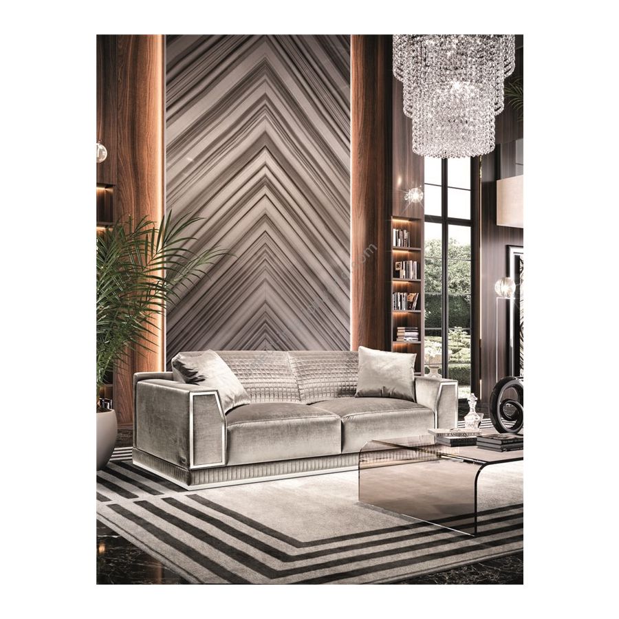 Sofa with partially removable coverings, in fabric and leather versions. Fir wood frame and poplar plywood can be inspected with a zip underneath the sofa. Non-deformable expanded polyurethane padding in different densities, seat cushion with SOFT SYSTEM type springs. The steel base and front metal inserts are standard. Instead, for particular finishes, please consider the increase according a price list. Backrest quilting can be ordered on request with an extra charge. Standard back cushions are padded with goose feathers.