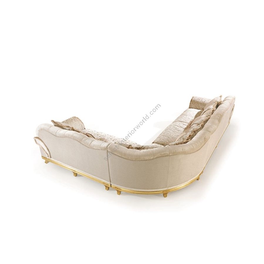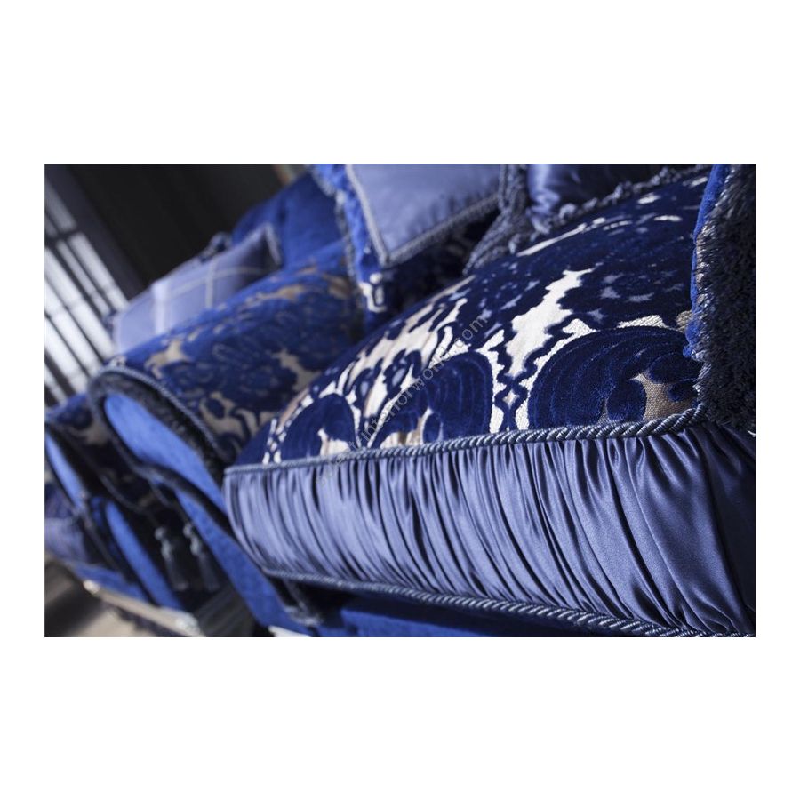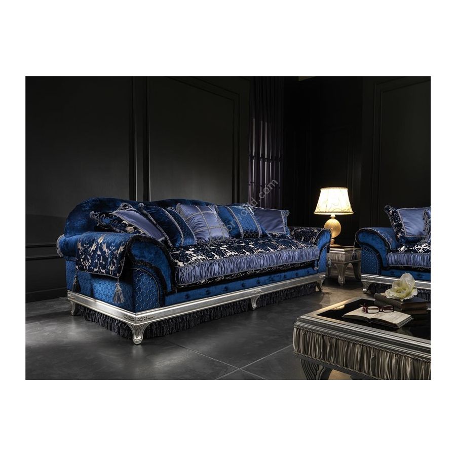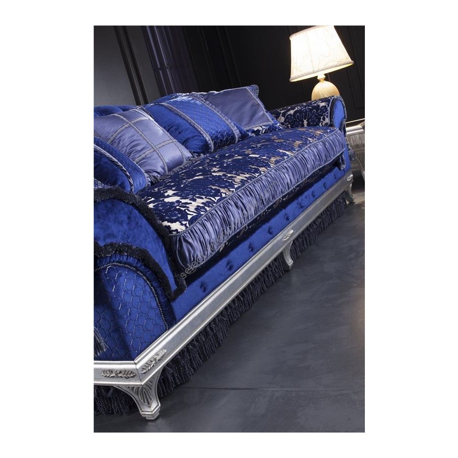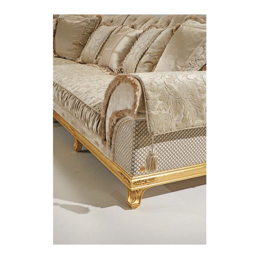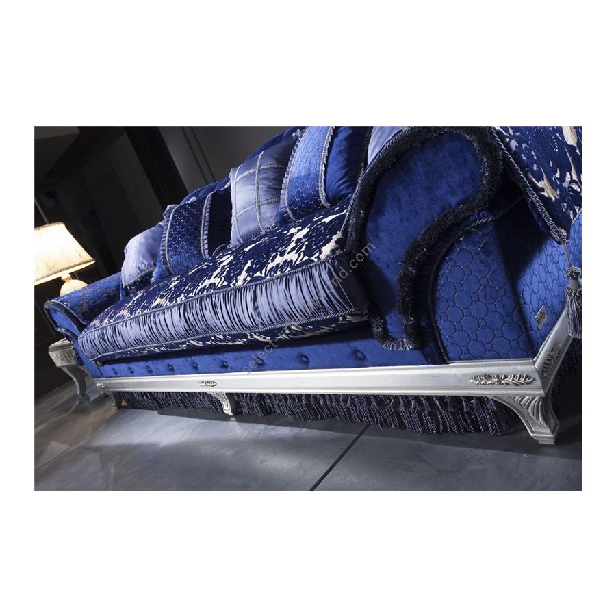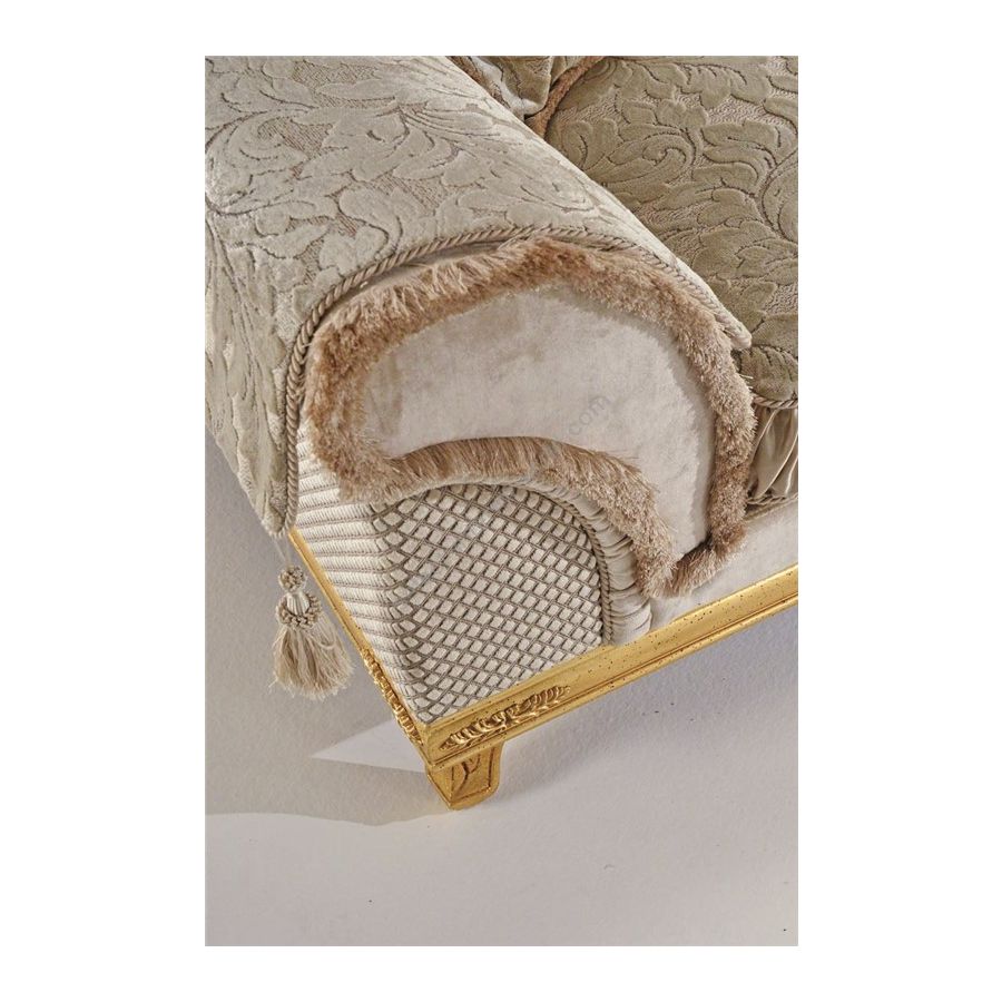 Sofa with a semiremovable seat covering. Fir wood and poplar multilayer structure. Non-deformable polyurethane foam upholstery with different densities. Reversible seat cuschions with down filling and SUPER-SOFT-SYSTEM springs. Armrest coverings, two upholstered cuschions and beechwood feet. Upon request cuschions and backrests adorned with fringed ribbon. Finish in gold or silver leaf with a choice of premium price. There is a bed version with one electro-welded standard support with H12 spring mattress.