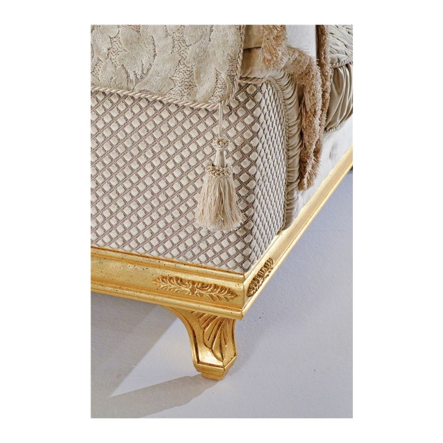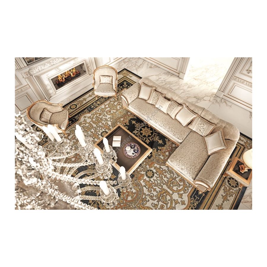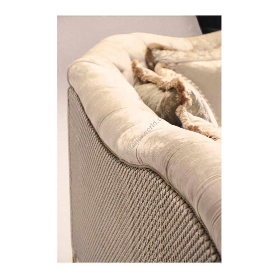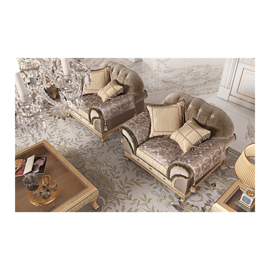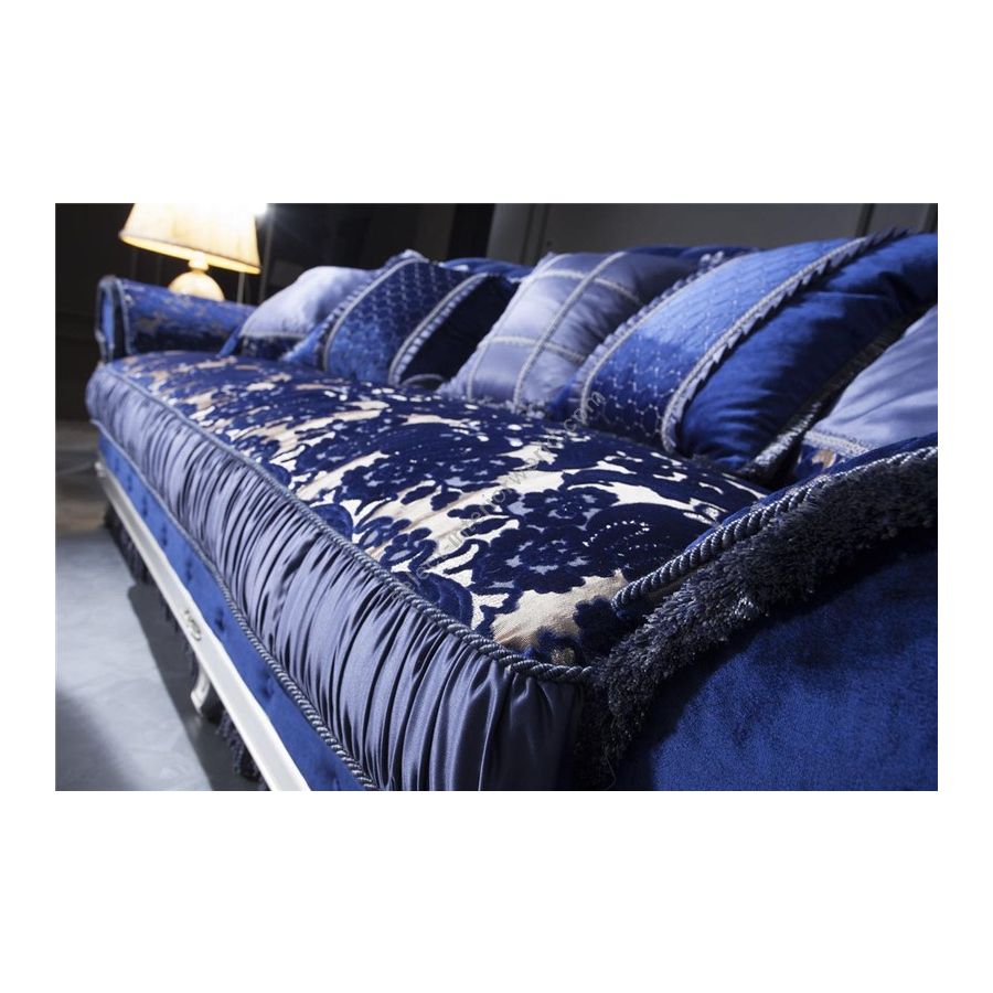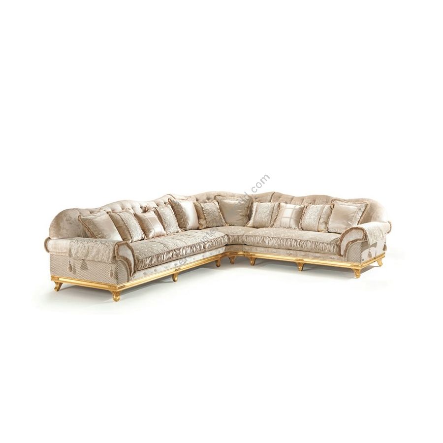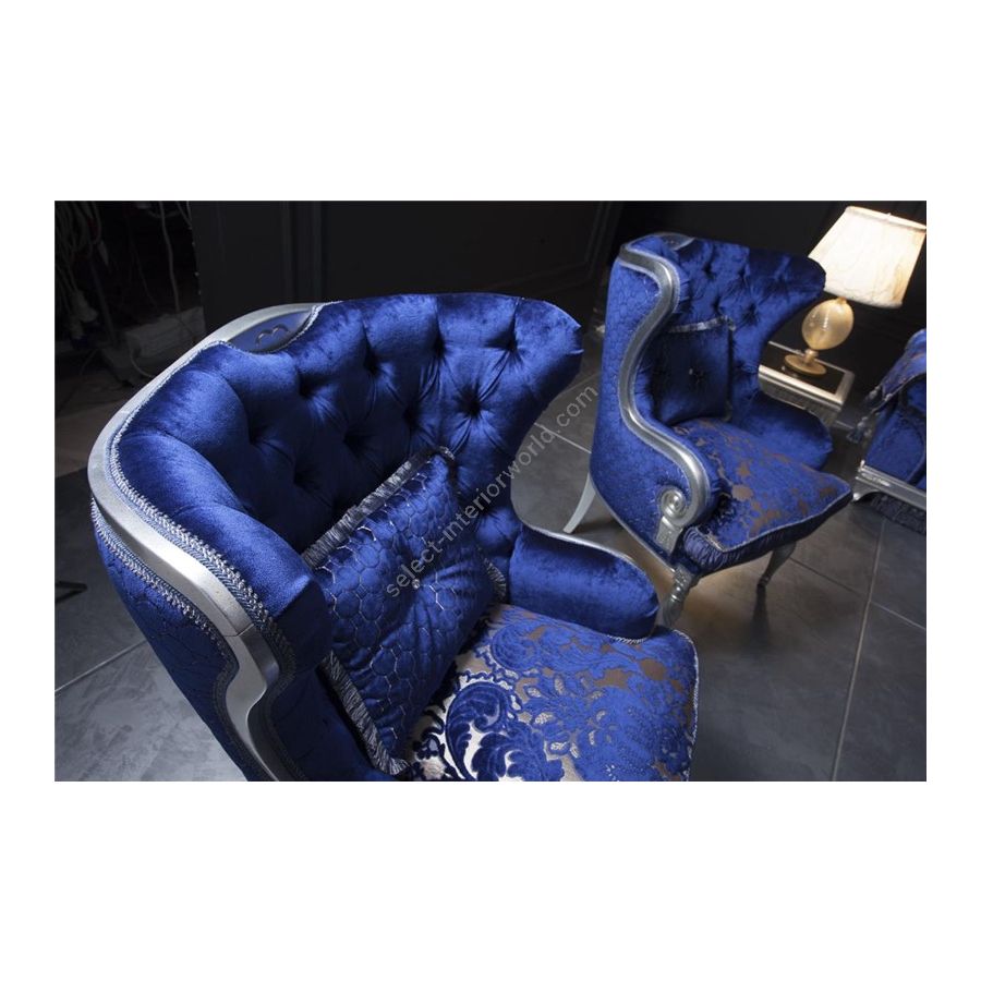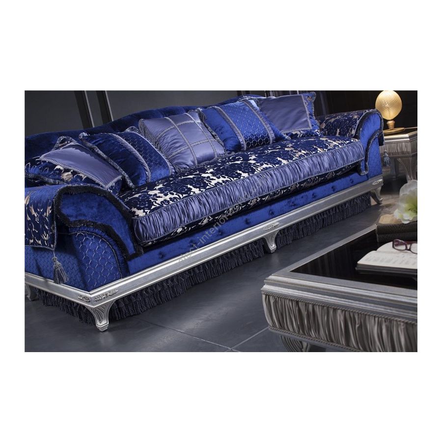 Sofa with a semiremovable seat covering. Fir wood and poplar multilayer structure. Non-deformable polyurethane foam upholstery with different densities. Reversible seat cuschions with down filling and SUPER-SOFT-SYSTEM springs. Armrest coverings, two upholstered cuschions and beechwood feet. Upon request cuschions and backrests adorned with fringed ribbon. Finish in gold or silver leaf with a choice of premium price. There is a bed version with one electro-welded standard support with H12 spring mattress.