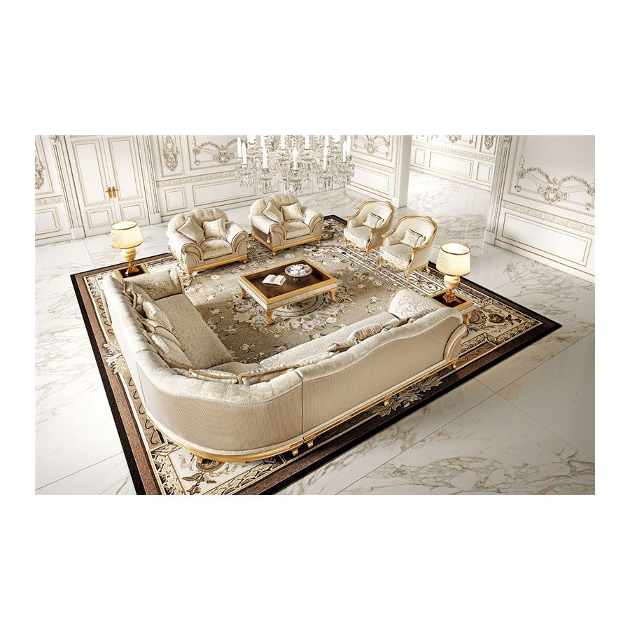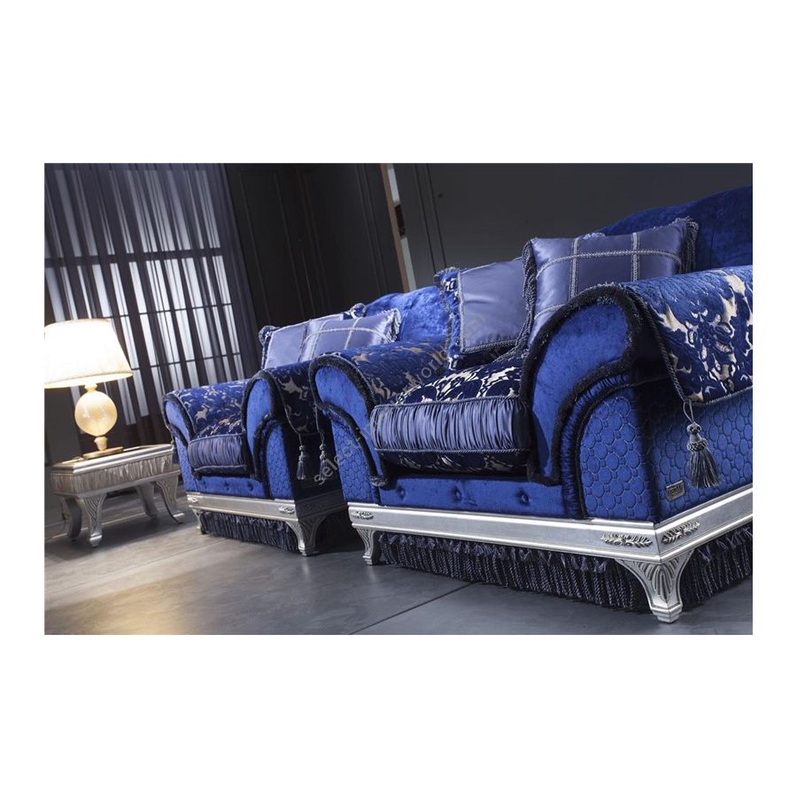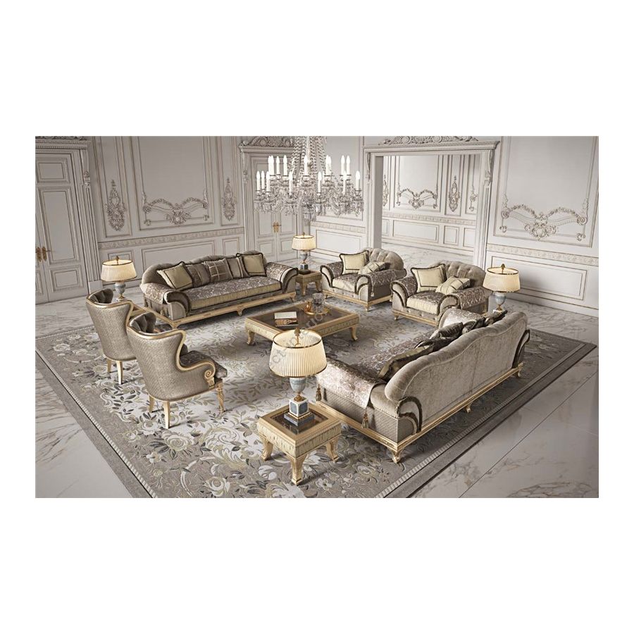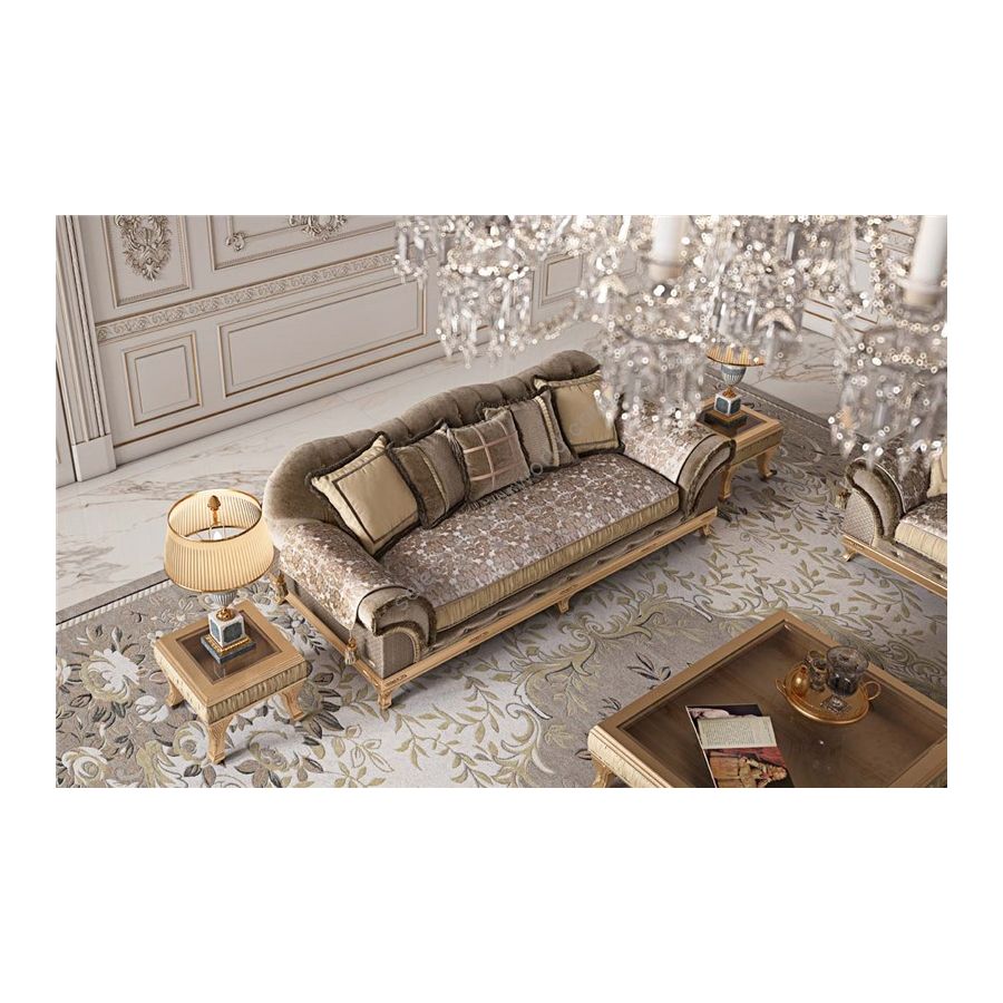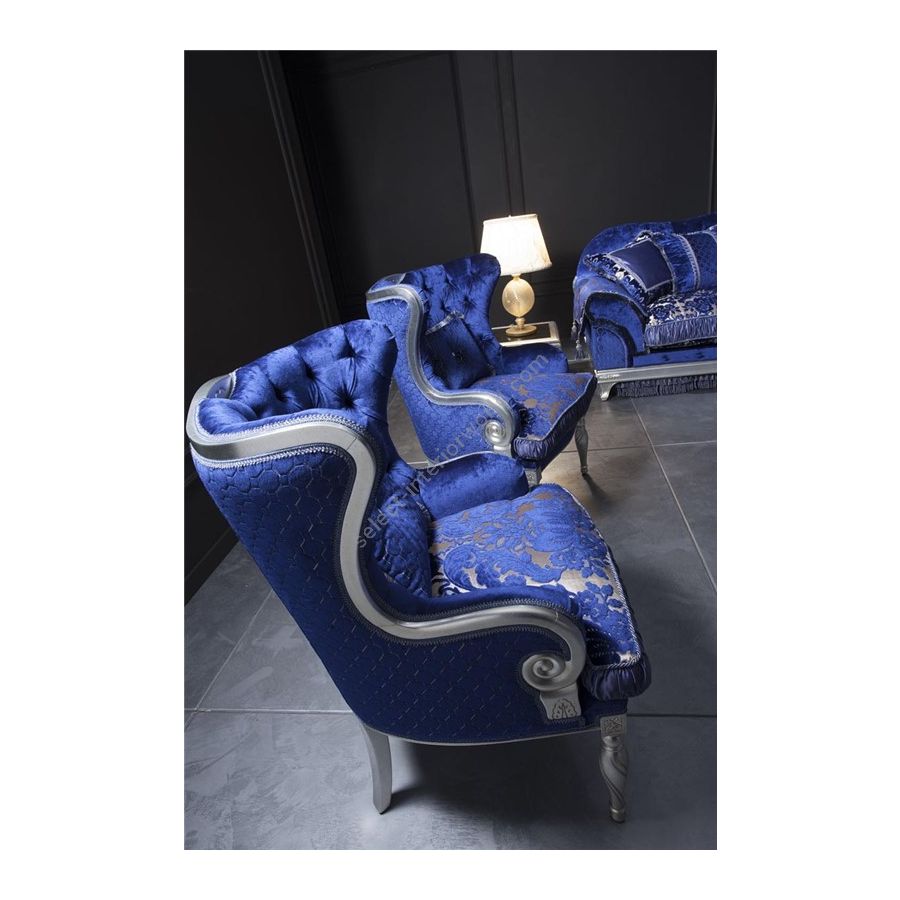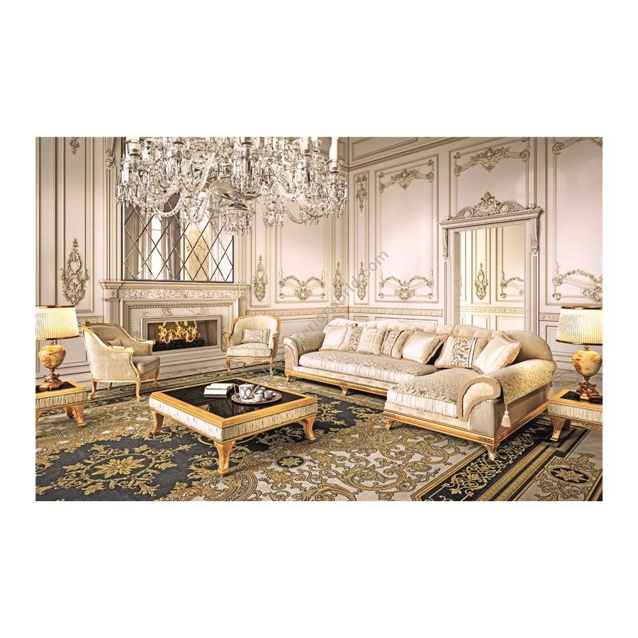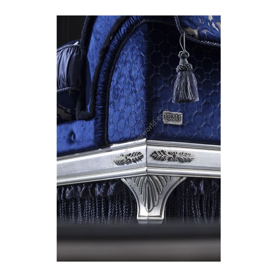 Sofa with a semiremovable seat covering. Fir wood and poplar multilayer structure. Non-deformable polyurethane foam upholstery with different densities. Reversible seat cuschions with down filling and SUPER-SOFT-SYSTEM springs. Armrest coverings, two upholstered cuschions and beechwood feet. Upon request cuschions and backrests adorned with fringed ribbon. Finish in gold or silver leaf with a choice of premium price. There is a bed version with one electro-welded standard support with H12 spring mattress.