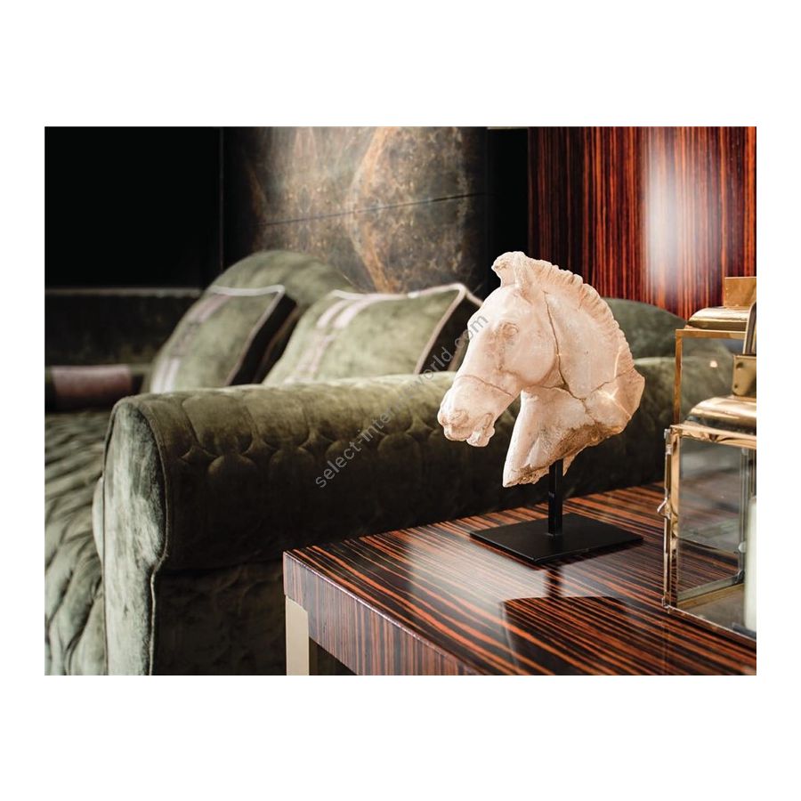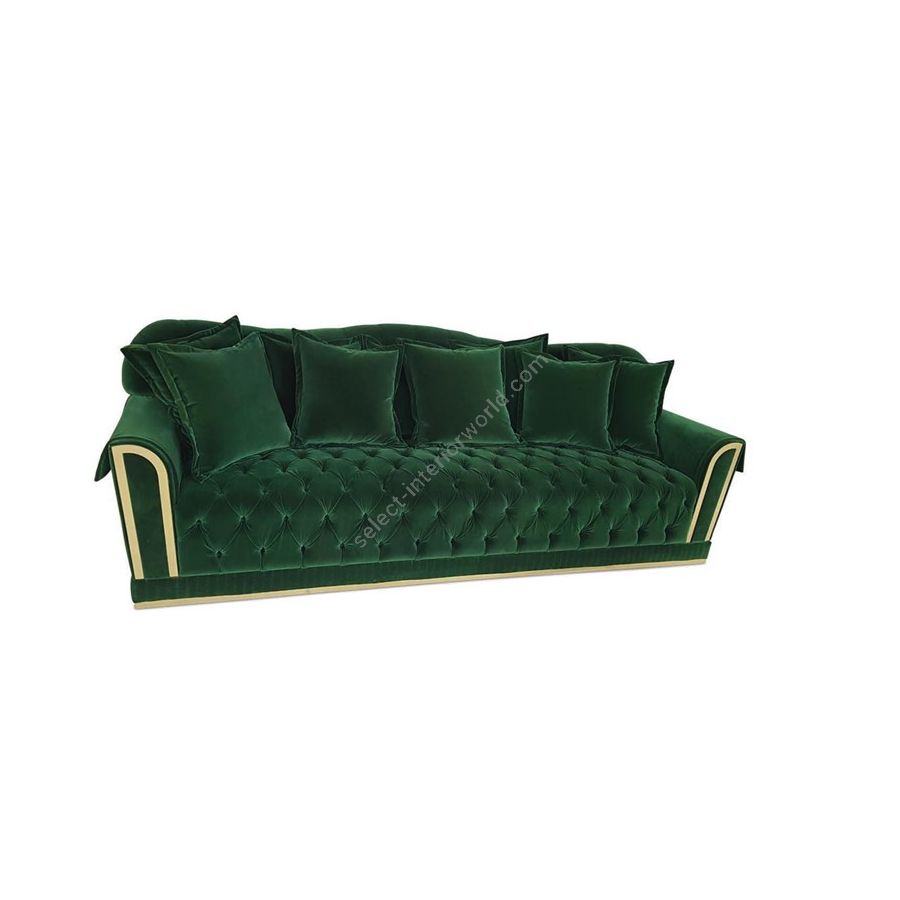 Sofa with partially removable lining. Fir wood frame with poplar plywood and beech wood inserts. Non-deformable expanded polyurethane padding in different densities. Seat cushion with SOFT SYSTEM type springs of capitonné manufacture. Goose down back panels are standard equipment. The base and panel are brushed brass and varnished with a glossy finish. Quilting is available on the rear panel of the sofa and on the sides of the armrests with an extra charge.