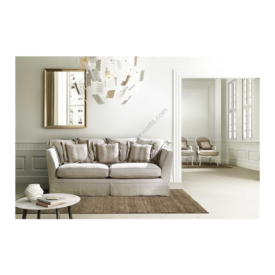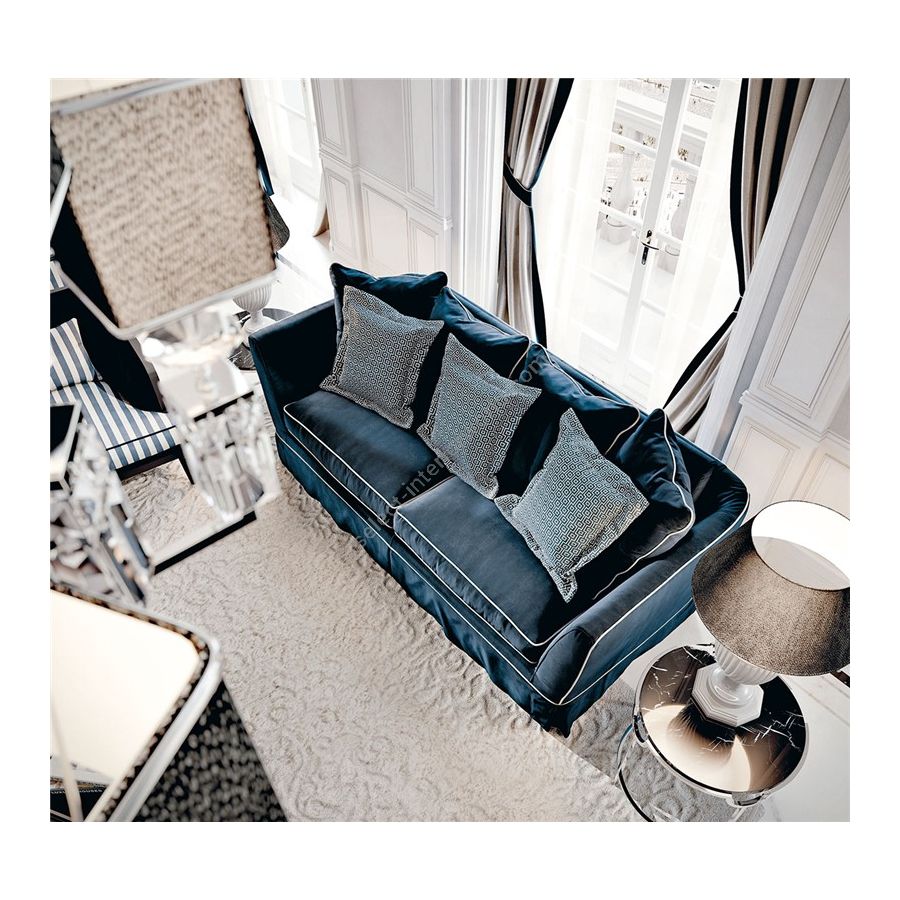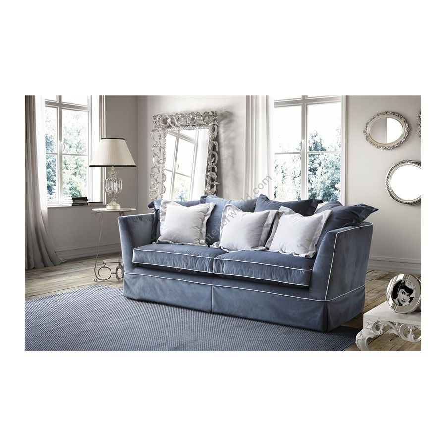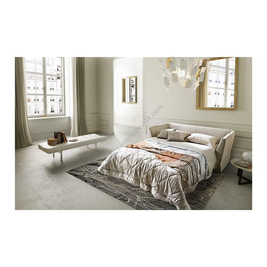 The model is with completely removable cover, body is in fir and poplar plywood viewed through the zip under the body. Padding is in nondeformable polyurethane foam of differentiated density. Seat cushions are in goose down of patented “Super Soft System” spring type. The overimposed down cushions are of series. It is available the bed version with the electrowelded grid of series and mattress H 11 in nondeformable polyurethane of high density 50 with the removable and washable cover in aloe. The down cushions are of series.