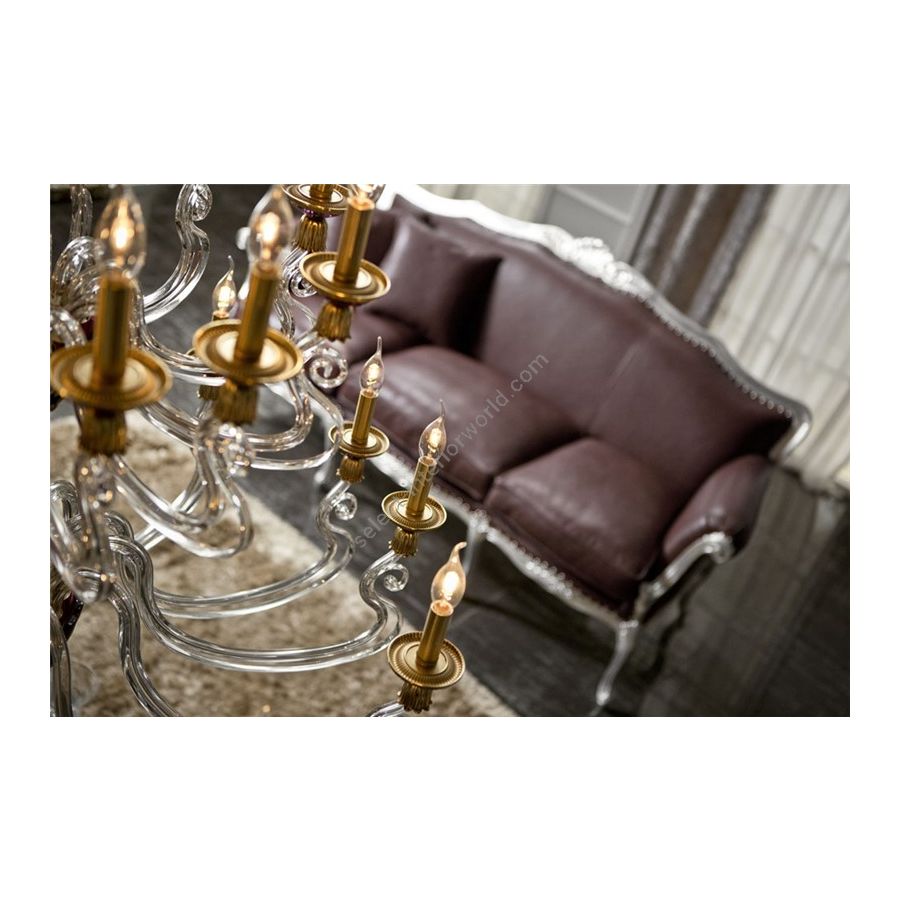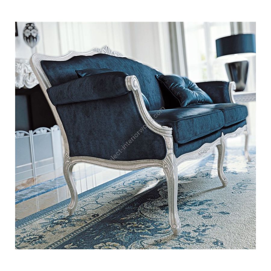This is a partially covered sofa. The frame is made of beech wood with hand finished details. Polyurethane padding at differentiated quotas, down seat cushions, finished with a border matching the fabric, pleating on request, classic or brush cording. The side cushions filled with down with central strass are standard. Consider a surcharge as per the price-list for gold or silver leaf finishing.
