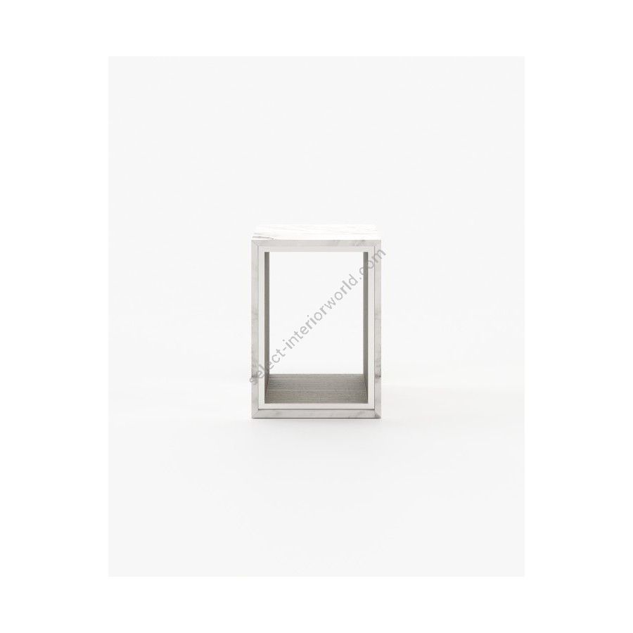 The Nilo side table is a unique and modern piece with a solid marble surface and a sturdy wooden interior, perfect for both living spaces and bedrooms.