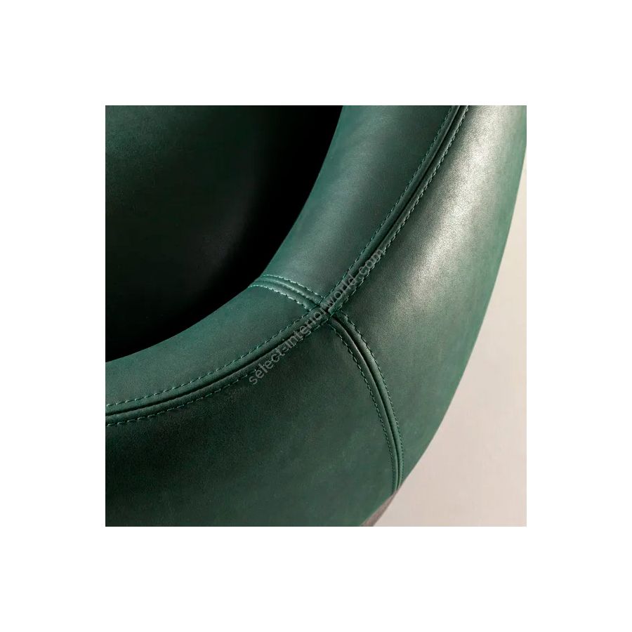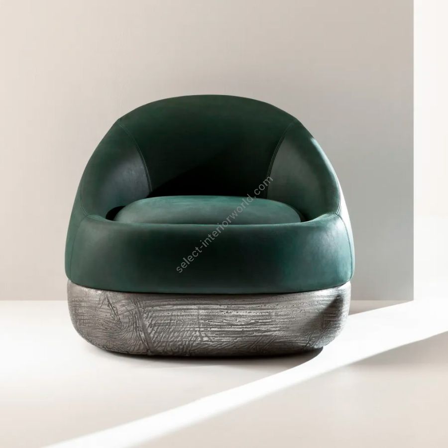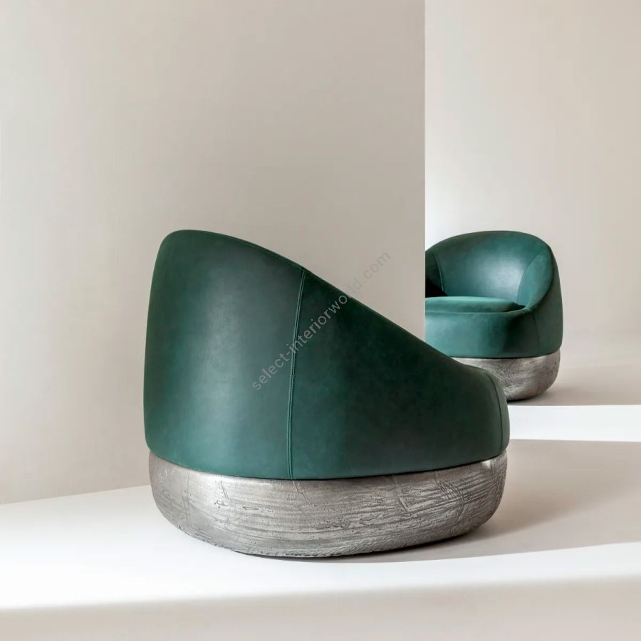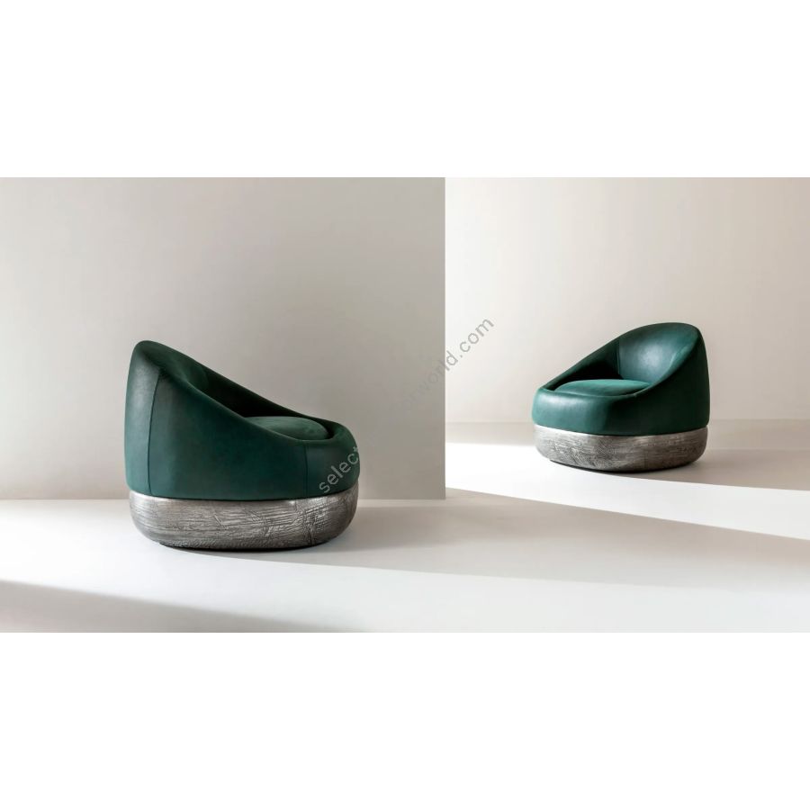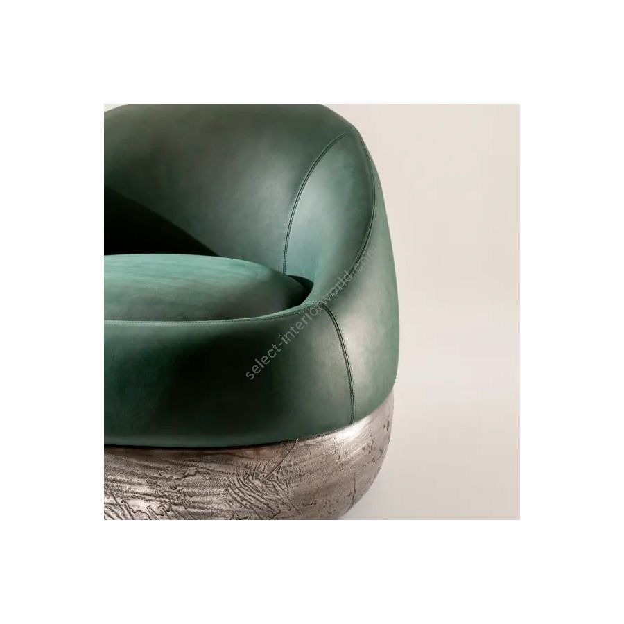 Swivel armchair inspired by the organic shapes of desert dunes. Defined by flowing, sculptural lines, Duna reveals a delicate balance between comfort and formal elegance. The rounded seat, upholstered in green Cloud 6099 leather, rests on a decorative swivel base in Raptor Liquid Metal Tin – a bold, tactile detail that adds a refined sense of movement and character. Available in leather, velvet, or fabric, with customizable base and upholstery finishes. Ideal for bespoke residential and hospitality interiors.