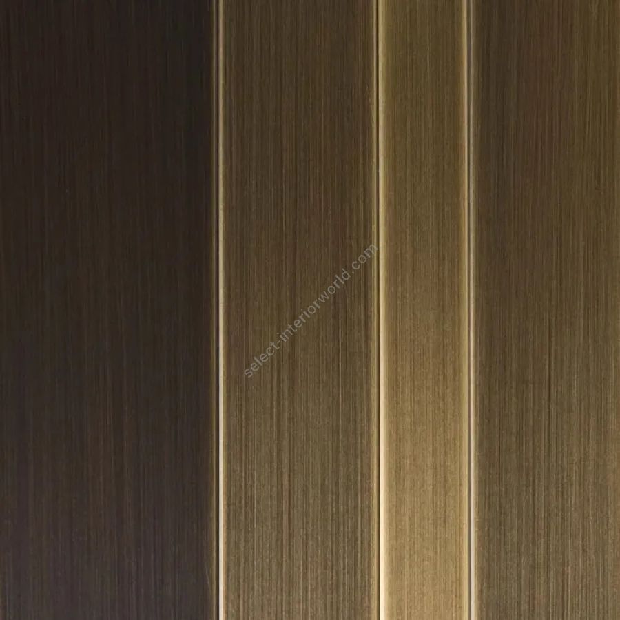 Bedside table with three drawers and structure covered in a sequence of metal bands. Interior in walnut Colore and black matt lacquered plinth.
