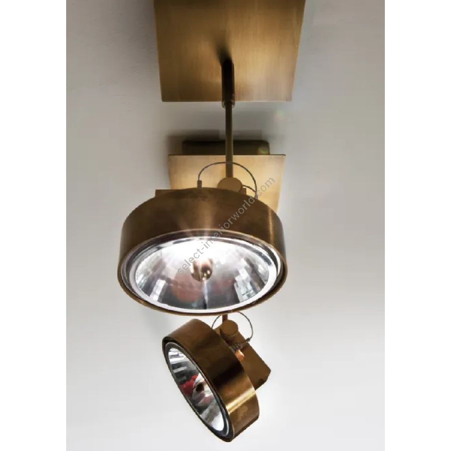 Adjustable spotlight in burnished brass designed for ceiling or wall fixing. Available in light or dark burnished brass.
