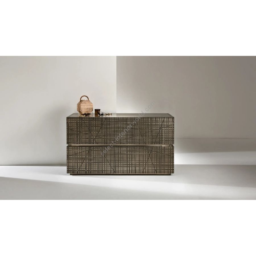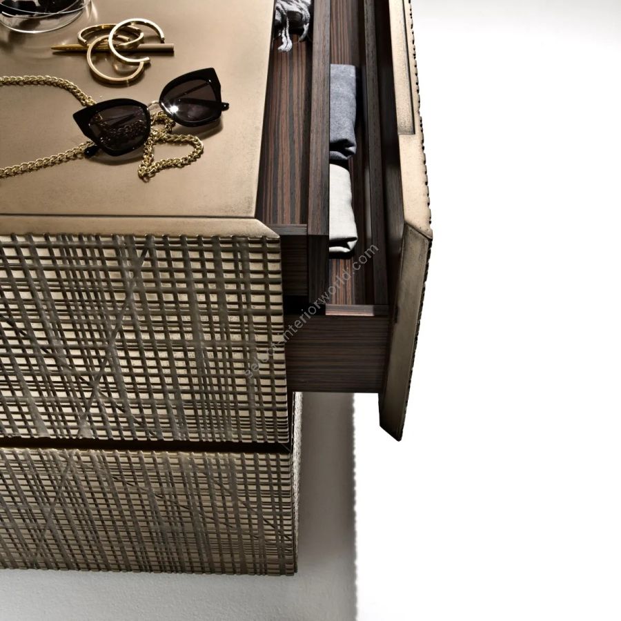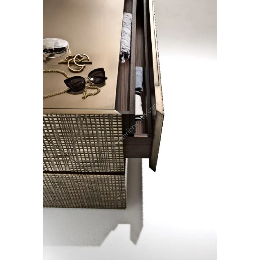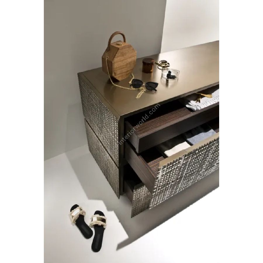 Wooden dresser with Maxima carved drawers and structure covered in liquid metal. Interior in Canaletto Walnut.