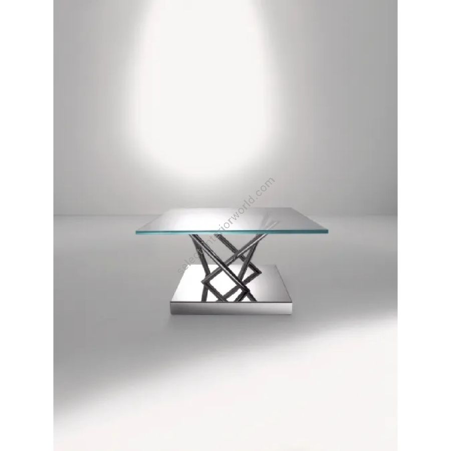 Family of coffee tables with polished steel or pewter finish structure, and extra-clear crystal top.