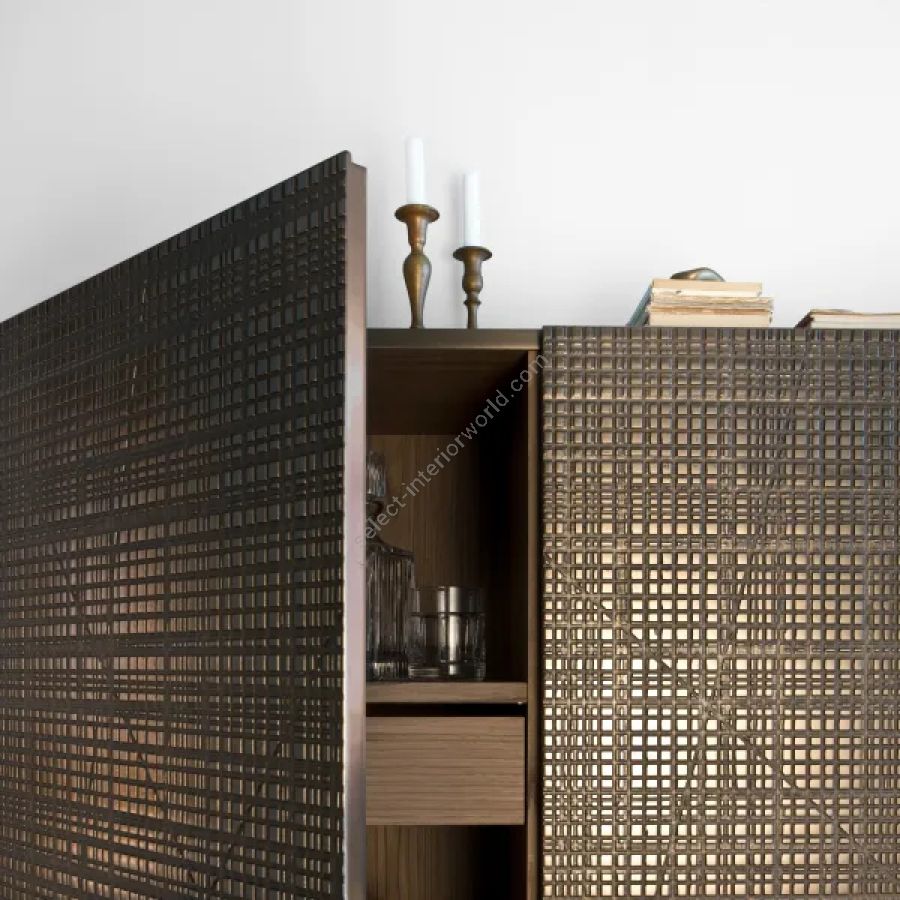 Tall sideboard in wood with carved Maxima hinged doors and structure covered in liquid metal. Legs and top with liquid metal finish. Interior in Canaletto walnut.