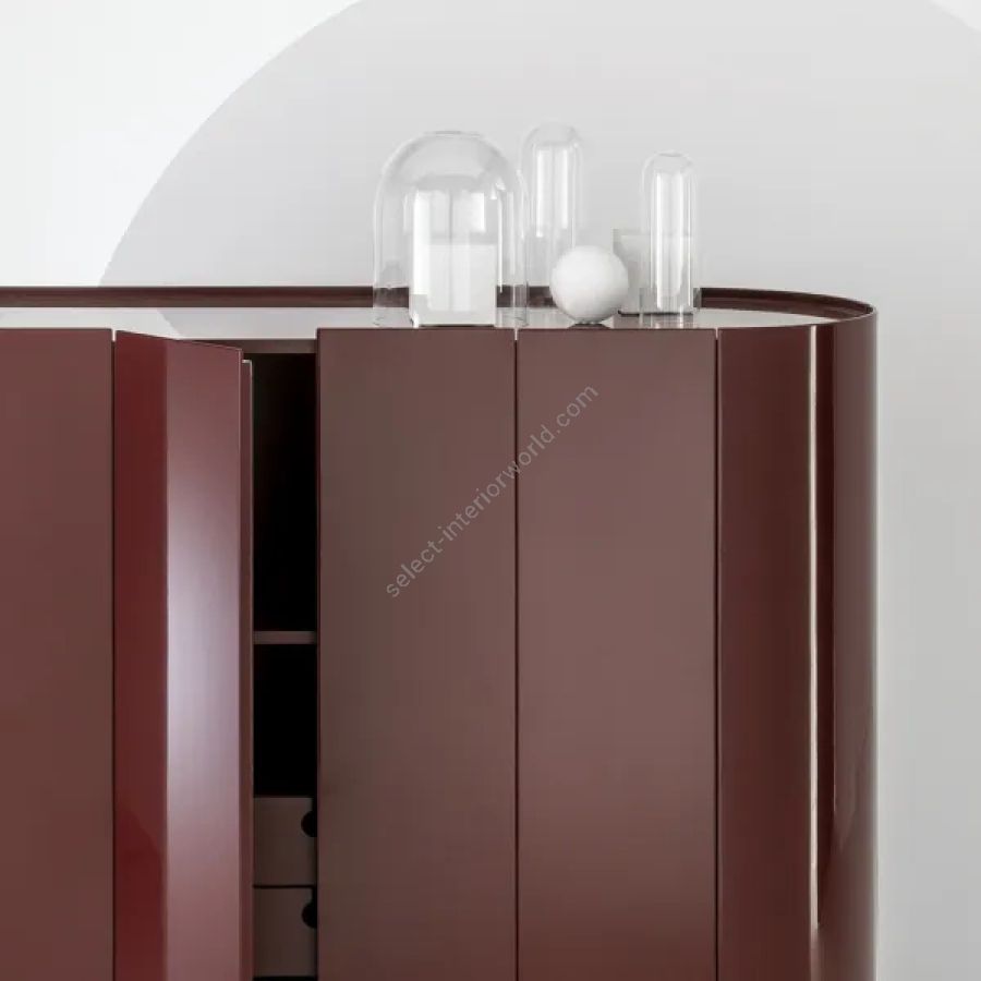Storage unit with 6 hinged doors and curved sides. Wooden structure finished on all sides. Equipped with internal shelves and drawers.