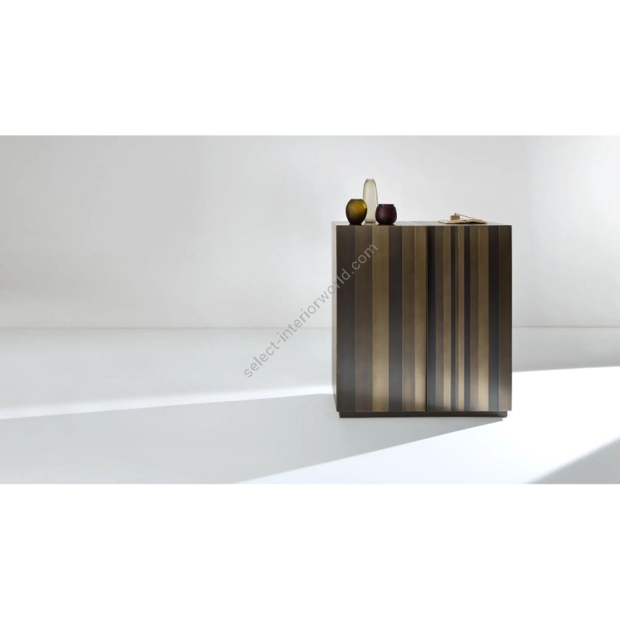 Tall sideboard with hinged doors and structure covered in a sequence of metal strips. Equipped with three internal drawers and a shelf. Interior in walnut Colore and metal plinth.