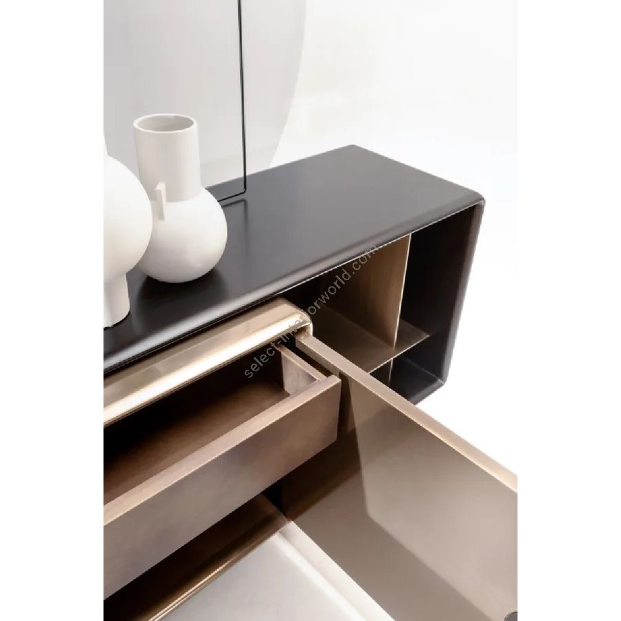 Wooden sideboard with liquid metal doors with Unlimited texture, open compartments with shelves and designer handle in burnished brass.