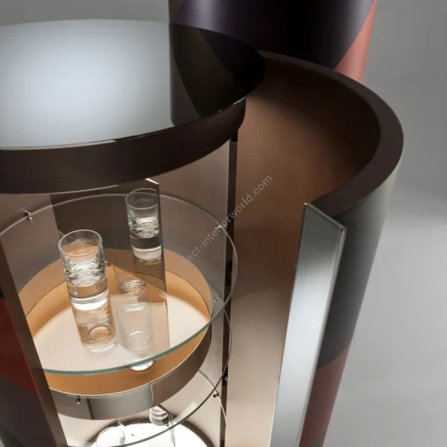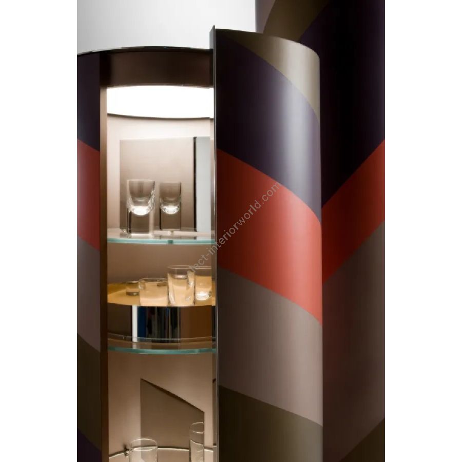 Totem with wooden structure and Lacca 61 finish in one or more colours. Top, handle and base in polished steel. Equipped with extra-light glass shelves and LED lighting.
