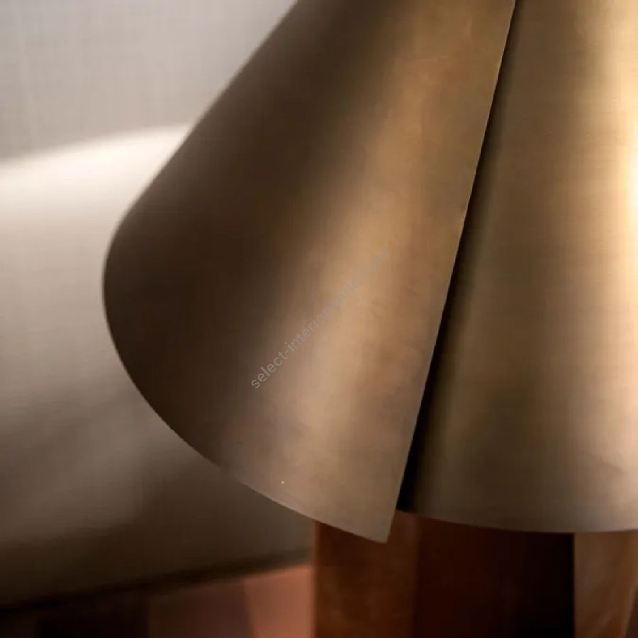 Table lamp with Volterra Alabaster base and burnished brass lampshade. Polyhedral alabaster base with satin brass side and rounded lampshade with a particular irregular cut.