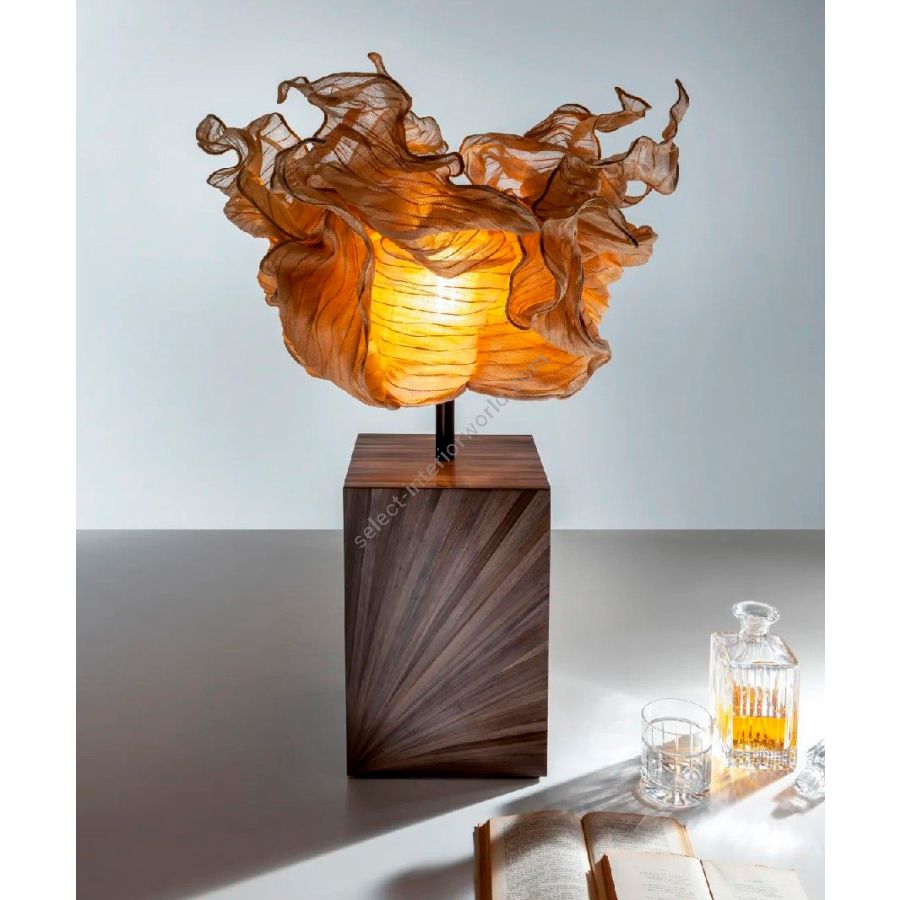 Table lamp with base in transparent glossy stained wood or decorated with a rye straw inlay.