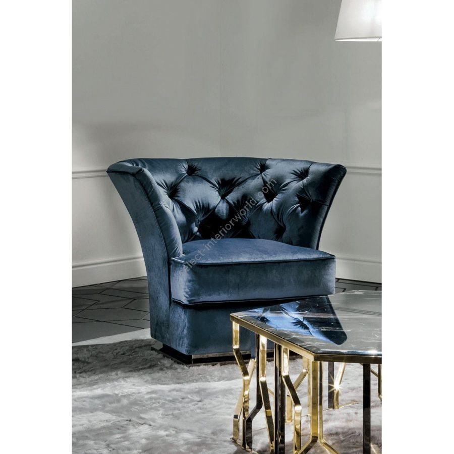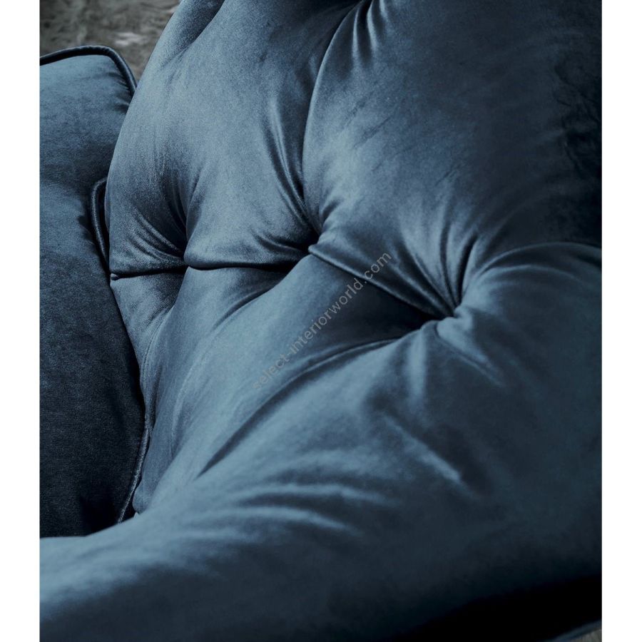 Frame in wood with elastic bands, covered in multithickness polyurethane foam. Seat cushion in sterilised goose down with insert in multi-thickness polyurethane foam. The internal cover has a “Capitonné” pattern, with buttons in plain colour. Given the special manufacturing process, fabric or leather upholstery is not removable. Metal base in the following finishes: Satin nickel, bright shaded brown, Black Rose gold, bright light gold, matt Champagne gold, bright chrome, bright black chrome, matt satin bronze, bright pink gold, matt pink gold.
