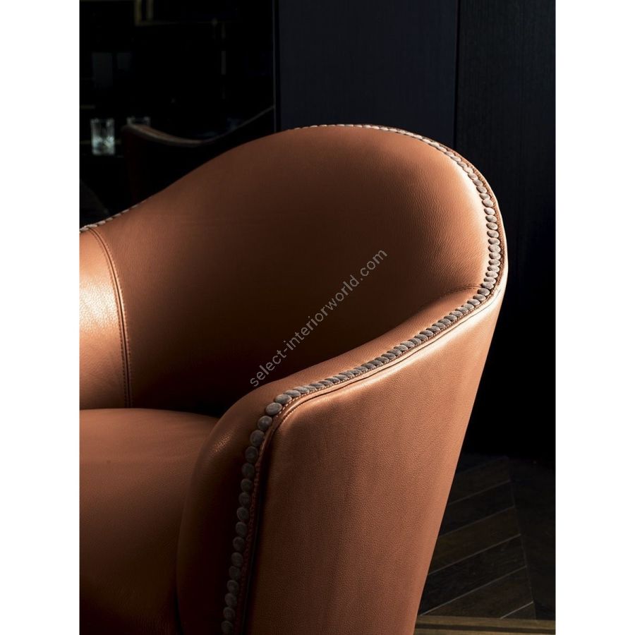 Swivel armchair (full 360° rotation) with leather or fabric upholstery, available with matching or two-tone profile or finished with visible buttons positioned manually and individually, in the finishes: bright chrome, matt black, bright light gold or matt antiqued gold, or covered in leather and, when possible, in velvet. The structure is in beech and fir plywood with high-resistance elastic bands, covered in high density polyurethane foam. The seat cushion is in multi-density polyurethane foam with rounded Memory Foam surface for better resistance to crushing over time, covered with a soft quilt of sterilised goose down. A painted bronze metal ring is placed on the base. Given the special manufacturing process, the upholstery on the seat and structure is not removable