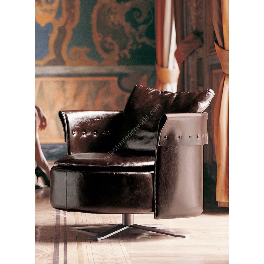 An important armchair on a swivel base, a “must” for the Loveluxe collection, Charme is a rich product with an essential line that entrusts the expressive impact of the project mainly to the precious materials used to make it. The backrest is an elegant, enveloping frame covered in leather that continues into the armrests, slightly widening on the ends and closed with leather-covered buttons to form a small fold like a light origami. The Charme bed and sofa were made following the success of this armchair.