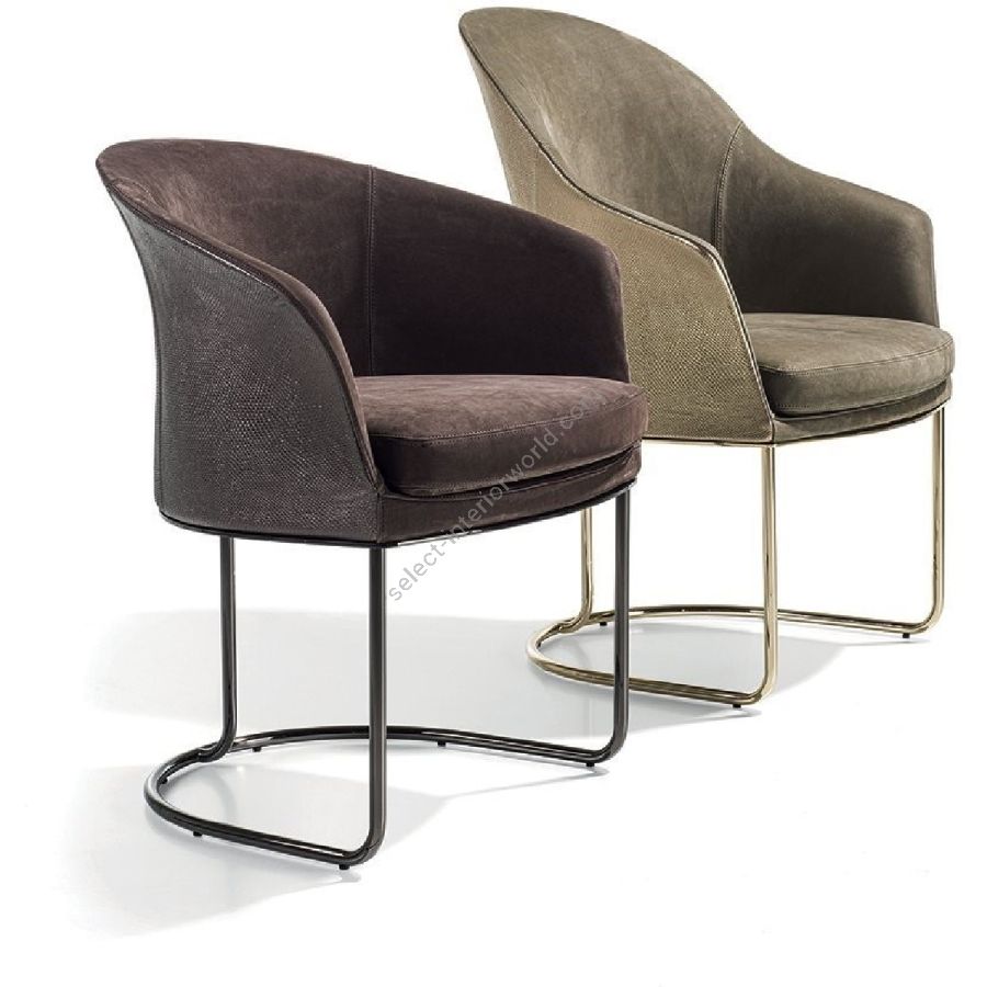 Chair offered in two versions: low backrest and wing-backed. The internal metal structure is cold-mouldedin foam. The seat cushion is in double density polyurethane foam covered in polyester fibre bonded with non-woven fabric. The base is in curved tubular metal assembled with a laser cut metal plate with the following finishes: Satin nickel, bright shaded brown, Black Rose gold, bright light gold, matt Champagne gold, bright chrome, bright black chrome, matt satin bronze, bright pink gold, matt pink gold. The upholstery CANNOT be removed from the structure, but the cushion covers in leather or fabric are removable.