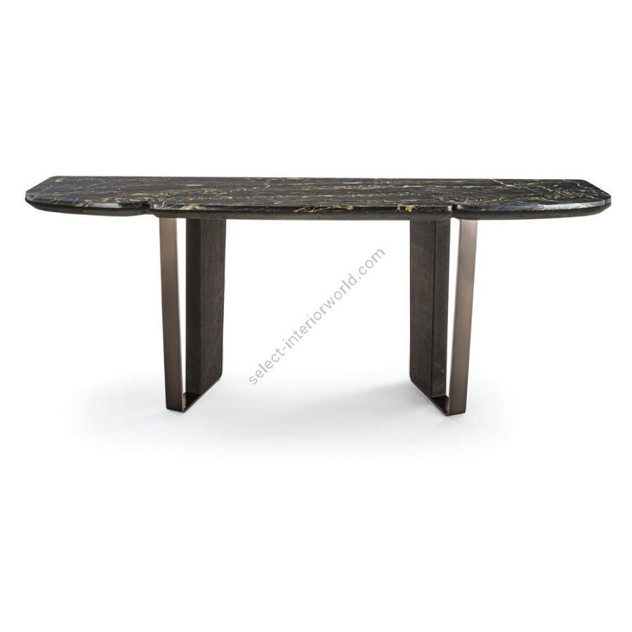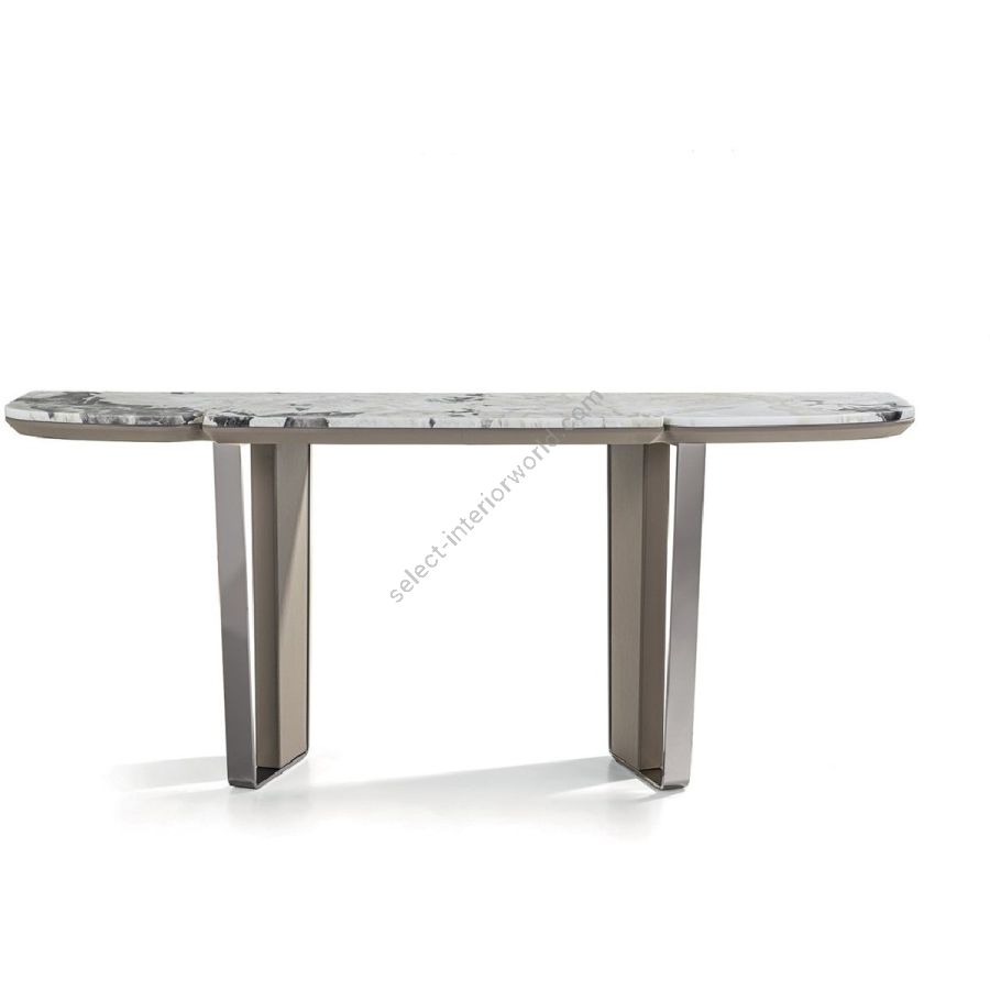 Console consisting of 2 trapezoidal legs and a shaped and sectioned top made of different materials. Machined and laser cut ground metal base in the finishes: Satin nickel, bright shaded brown, Black Rose gold, bright light gold, matt Champagne gold, bright chrome, bright black chrome, matt satin bronze, bright pink gold, matt pink gold. The leg insert is covered in leather from the catalogue or in wood: glossy/matt ebony, glossy/matt Maple, glossy/matt heat-treated Eucalyptus, Canaletto walnut stained glossy/matt Macadamia, glossy/matt Sycamore frisè. Under-top covered in leather from the catalogue, if desired, matching the leg insert. The top, divided into 3 parts, is in the finishes: White Carrara marble, Imperial Brown marble, Sahara Noir marble (glossy and matt polyester finish), Dover White marble, Panda White marble, Guatemala Green marble, Corteccia marble, Port Saint Laurent marble, Red Levanto marble, Bardiglio Nuvolato marble, Elegant Brown marble, Shale Rosewood marble, Emperador Dark marble, SilverWave marble, Agatha Black marble, Frappuccino marble, Calacatta marble, Fusion Light marble, Patagonia marble, Explosion Blue marble, Fusion Multicolor marble, Juliet Quartz marble, Azul Macauba marble,(Onyxes on request), or in wood.