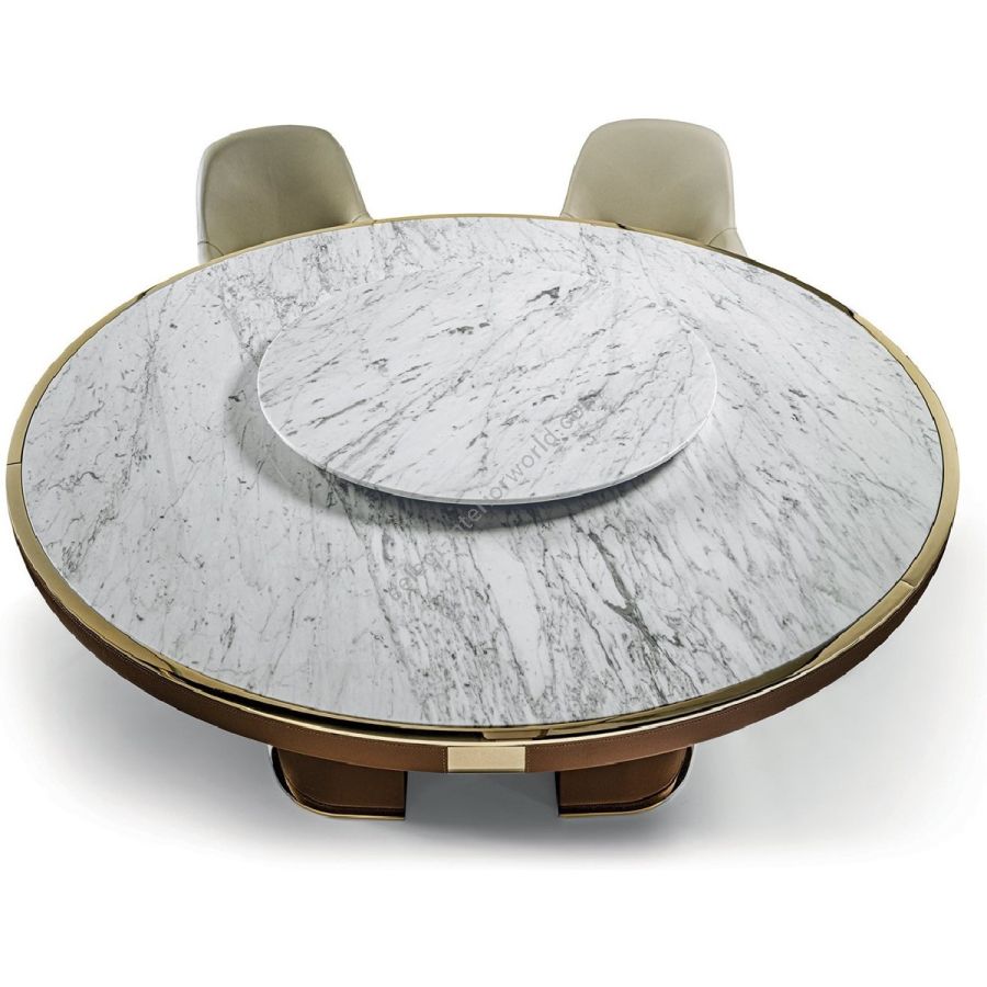 Table with 2 legs in glass fibre, covered externally in leather and internally in metal sheet in the following finishes: Satin nickel, Bright shaded brown, Black Rose gold, bright light gold, matt Champagne gold, bright chrome, bright black chrome, matt satin bronze, bright pink gold, matt pink gold. To complete the leg, thebase is enhanced with a metal foot in the same finish as the plate. The undertop is covered in leather fromthe catalogue, like the leg, and decorated with metal inserts coordinated with the metal sheet on the base. The top has a perimeter border in metal that encloses the top, in the finishes: White Carrara marble, ImperialBrown marble, Sahara Noir marble (glossy and matt polyester finish), Dover White marble, PandaWhite marble, Guatemala Green marble, Corteccia marble, Port Saint Laurent marble, Red Levanto marble, Bardiglio Nuvolato marble, Elegant Brown marble, Shale Rosewood marble, Emperador Dark marble, SilverWave marble, Agatha Black marble, Frappuccino marble, Calacatta marble, Fusion Light marble, Patagonia marble, Explosion Blue marble, Fusion Multicolor marble, Juliet Quartz marble. A lazy susan (cm Ø 75-90-110) is available to set on the top, in the finishes: glossy lacquered wood in range colours, glossy/matt Maple, glossy/matt heat-treated Eucalyptus, glossy/matt Sycamore frisè, glossy/matt Ebony, glossy/matt Canaletto walnut, glossy Walnut burl wood or in marble in the varieties listed in the catalogue.