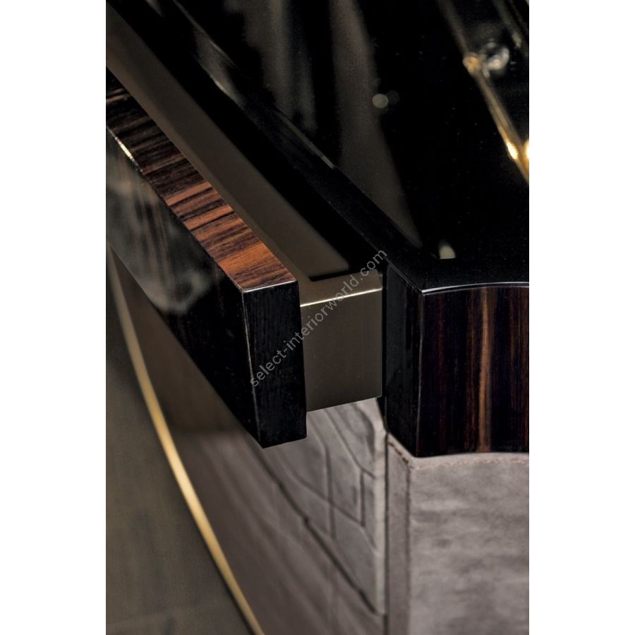 Chest of drawers in two versions: for use against a wall, or as an island. Offered entirely upholstered in leathers from the catalogue, or with the drawer layer beneath the top in wood: Glossy/matt Sycamore frisè, Glossy/matt ebony, Glossy walnut burl wood. The 3D effect drawer front covering with raised “Diamond” or “Sequence” decoration is only available in the P.3 Suede and Lusso range. Top surface finish: 5 mm bronze or smoky bevelled mirror. 20mm marble with 20mm bevel: Sahara Noir marble (polyester finish), Dover White marble, Panda White marble, Guatemala Green marble, Corteccia marble, Port Saint Laurent marble, Red Levanto marble, Bardiglio Nuvolato marble, Elegant Brown marble, Shale Rosewood marble, Emperador Dark marble, Silver Wave marble, Agatha Black marble, Frappuccino marble, Calacatta marble, Fusion Light marble, Patagonia marble, Explosion Blu marble, Fusion Multicolor marble, Juliet quartz marble, Calcite Azul marble. Metal ring in the following finishes: Black Rose gold, bright shaded brown, bright light gold, matt Champagne gold, bright chrome, bright black chrome, matt satined bronze, bright pink gold, matt pink gold. Flush handles in metal, with insert in marble chosen from the samples, drawers with push-pull opening mechanism.