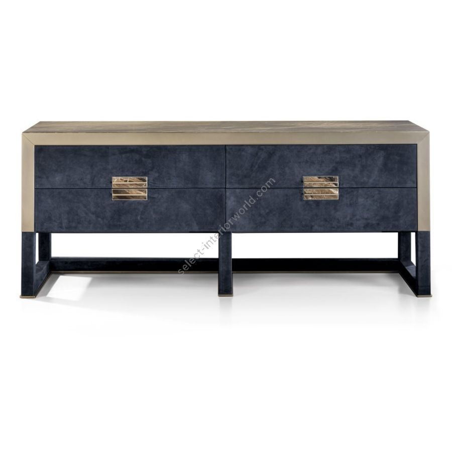 Chest of 4 drawers. Legs and frame covered in leather or cashmere Loro Piana Interiors from the range or wood: glossy lacquered wood in range colours, glossy/matt ebony, glossy/matt Canaletto walnut, glossy/matt Sycamore frisè. Profile of base and cornice in ground metal in the finishes: bright shaded brown, bright light gold, matt Champagne gold, bright chrome, bright black chrome, matt satin bronze, bright pink gold, matt pink gold, Black Rose gold. Top finish: bronze or smoky mirror with 20 mm bevel, black painted glass with 20 mm bevel, glossy lacquered wood in range colours, glossy/matt ebony, glossy/matt Canaletto walnut, glossy/matt Sycamore frisè. Marble mm 20 thick: Portoro marble, Fusion Light marble, Patagonia marble, Explosion Blu marble, Fusion Multicolor marble, Juliet quartz marble, Calcite Azul marble, Sahara Noir marble (polyester finish), Dover White marble, Panda White marble, Guatemala Green marble, Corteccia marble, Port Saint Laurent marble, Red Levanto marble, Bardiglio Nuvolato marble, Elegant Brown marble, Shale Rosewood marble, Emperador Dark marble, Silver Wave marble, Agatha Black marble, Frappuccino marble, Calacatta marble. Handle in marble from the range or like the top. On the back, two dimmable LED strips light the lower and upper part of the chest. They are turned on with a touch-sensitive switch. The effect is a strip of light that illuminates the wall.