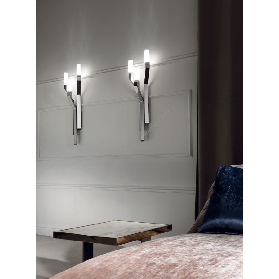 Lamps in ground metal, available in the following finishes: Black Rose gold, bright shaded brown, bright light gold, matt champagne gold, bright chrome, bright black chrome, matt satined bronze. Lampshade in opaline Plexiglas. Illumination 12V with warm led lighting.