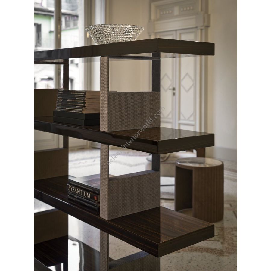 Modular bookcase made up of shelves in two lengths, assembled with supports / dividers in metal covered in leather from the range. Shelf finishes: - glossy lacquered wood in range colours, - glossy/matt Maple, - glossy/matt heat-treated Eucalyptus, - glossy/matt ebony, - glossy/matt Canaletto walnut, - glossy/matt Sycamore frisè. Metal base.