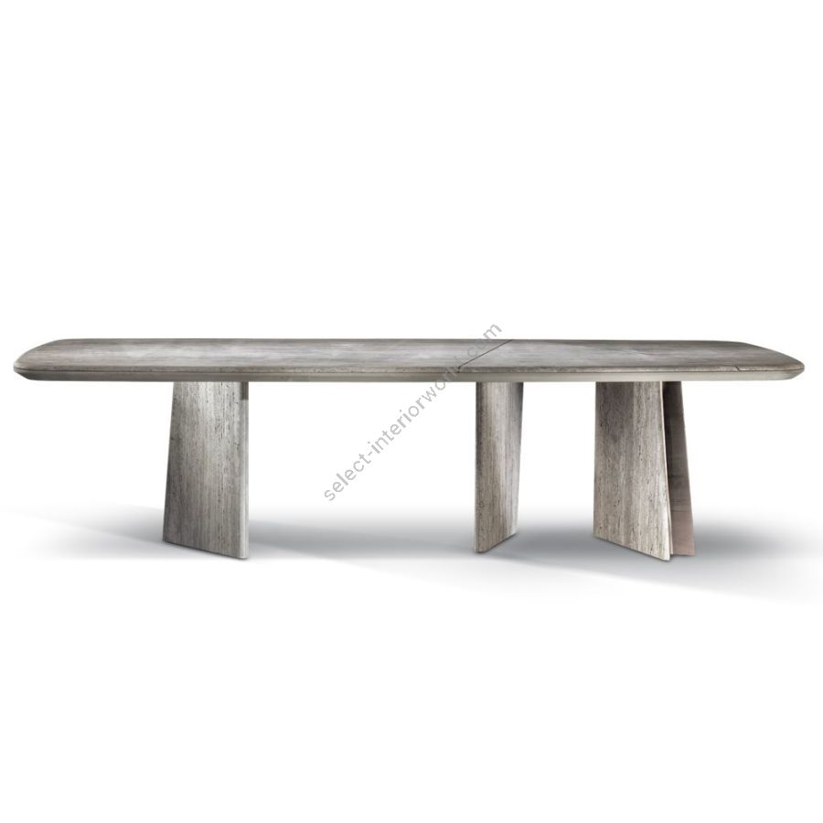 Table with 3 trapezoidal triangular legs covered in marble, coordinated with the top, and with rounded edges: Travertino, Silver Beola, Cipollino marble, Arabescato Orobico marble, Silver Stream marble, WhiteCarrara marble, Imperial Brown marble, Elegant Brown marble, Sahara Noir marble (polyester finish),Dover White marble, Guatemala Green marble, Red Levanto marble, Shale Rosewood marble, Emperador Dark marble, Silver Wave marble, Agatha Black marble, Frappuccino marble, Calacatta marble, Patagonia marble, Juliet Quartz marble. The leg interior has a curved metal insert in the following finishes: satinedChampagne, Bright/satined Burnished, Shaded copper, Bright/satined brown, Bright/satined Black Rose,Bright/satined light gold, Bright/satined chrome, Bright/satined black chrome, Matt satined bronze. The under top part is in leather with a metal border in the same leather as the insert. The marble top (20 mm thickness) is always coordinated with the leg finish. In the maxi version (330x130 - 300x110 cm), the top comes in 3 parts. Between the parts are 2 linear inserts in metal coordinated with the legs.