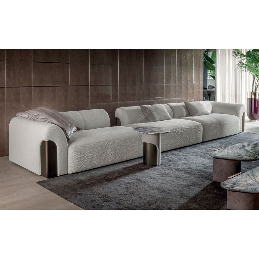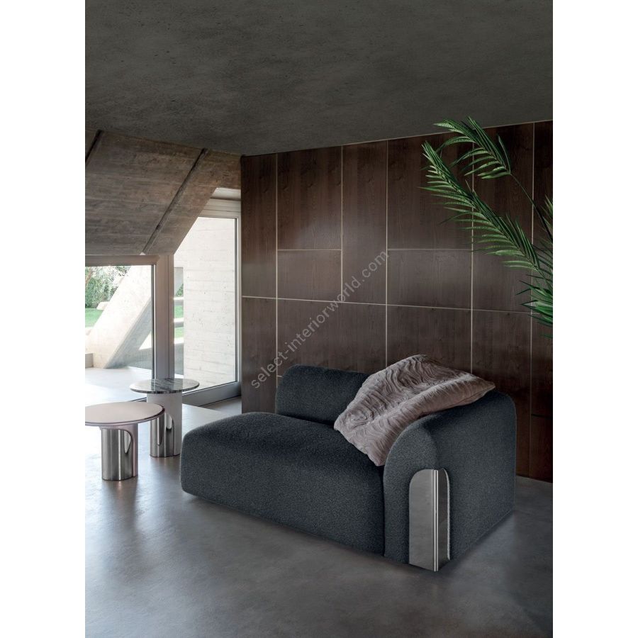 Sofa made up of elements with simple lines, ideal for linear or semiangular compositions. The open armrests and backrests have a chromed metal plate set into them, which enhances the curves in the various elements. This plate comes in the finishes: Shaded copper, Bright shaded brown, Black Rose gold, bright light gold, Champagne gold, bright chrome, bright black chrome, matt satined bronze. Comfort is a major priority for this piece. Special polyurethane foams were mixed together to provide softness, resilience, and crush resistance. The seats are supported at the base by special elastic PVC slats, in turn supported by a solid wooden structure. The most significant characteristic is an exclusive quilted “Groove” decoration that, on request, can decorate the front part of the various elements. Made by hand, it gives the product a three-dimensional effect and accents its exclusive originality. A series of decorative cushions in various sizes and finishes complete the collection. Given the particular assembly of the product, the upholstery is NOT removable.