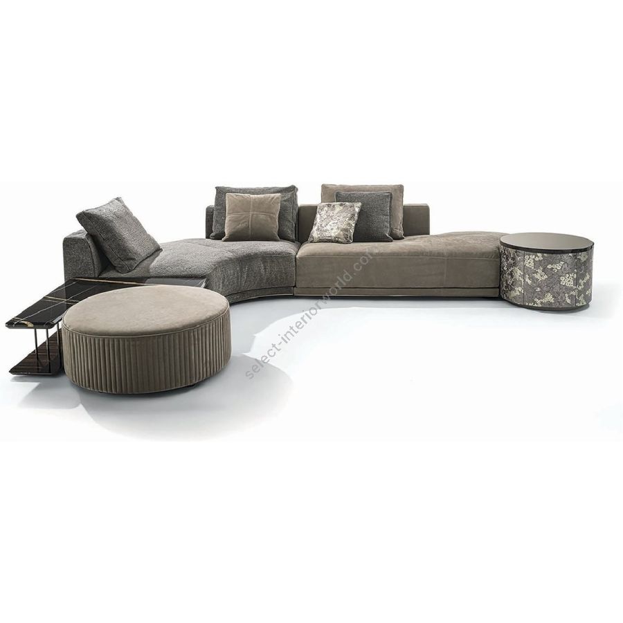 This collection of sofas and modular pieces that make it possible to form captivating compositions facilitates the development of contemporary design. Some concave elements are shaped to combine bar tables, poufs or other accessories. The wood structure sets on a surface made of poplar and fir plywood, and the entire piece is covered in high density polyurethane foam. Seat cushions feature multi-density polyurethane foam interiors with a rounded outer Memory Foam layer, all encased in soft sterilized goose down. The backrest cushions are in sterilised goose down. The elegant metal detail inserted in the armrest and the metal frame around the sofa base are offered in the following finishes: Satin nickel, Bright shaded brown, Black Rose gold, bright light gold, matt Champagne gold, bright chrome, bright black chrome, matt satin bronze, bright pink gold, matt pink gold. The upholstery CANNOT be removed from the structure, but the cushion covers in leather or fabric are removable. Small round bar table with structure upholstered in leather from the catalogue. Doors with push-pull opening. The interior houses a bottle-holder tray covered in leather from the catalogue (matched with the structure). Ground metal edges in the following finishes: Satin nickel, Bright shaded brown, Black Rose gold, bright light gold, matt Champagne gold, bright chrome, bright black chrome, matt satin bronze, bright pink gold, matt pink gold. Top finishes: bronze or smoky mirror, Portoro marble, Azul Macauba marble, White Carrara marble, Imperial Brown marble, Sahara Noir marble (glossy and matt polyester finish), Dover White marble, Panda White marble, Guatemala Green marble, Corteccia marble, Port Saint Laurent marble, Red Levanto marble, Bardiglio Nuvolato marble, Elegant Brown marble, Shale Rosewood marble, Emperador Dark marble, Silver Wave marble, Agatha Black marble, Frappuccino marble, Calacatta marble, Fusion Light marble, Patagonia marble, Explosion Blue marble, Fusion Multicolor marble, Juliet Quartz marble, Calcite Azul marble. Or in wood in the finishes: glossy/matt Maple, glossy/matt heat-treated Eucalyptus, glossy/matt Sycamore frisè, glossy/matt Ebony, glossy/matt Canaletto walnut, glossy walnut burl wood.