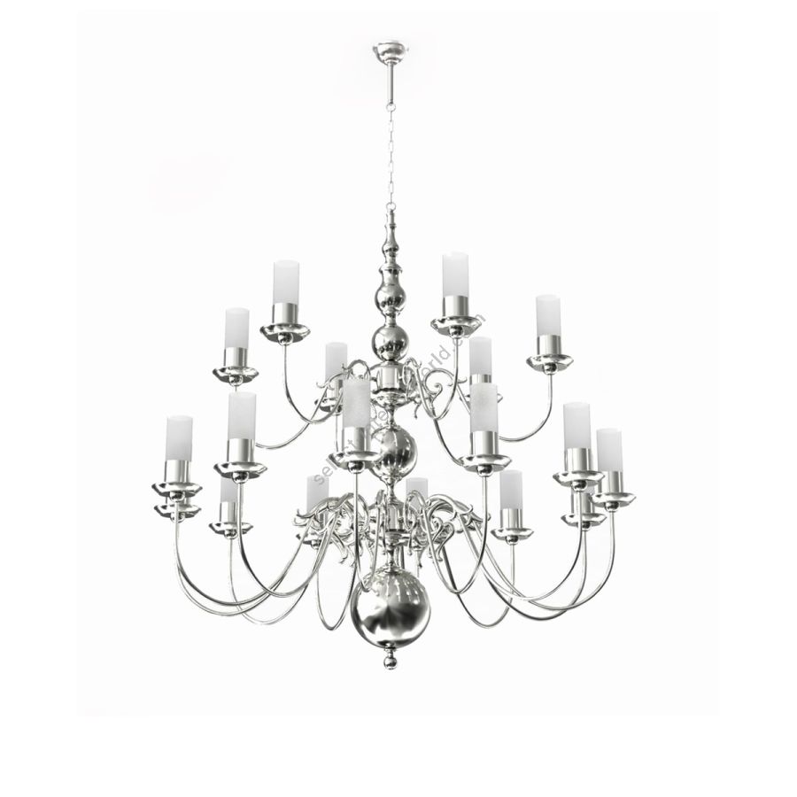 This particular model comes with 18 light points, a polished nickel finish brass structure and glass diffusers. Available in various finishes.
