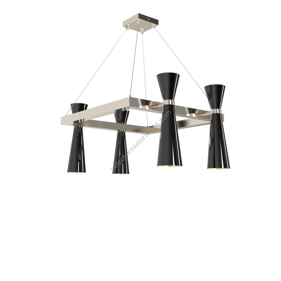 The chandelier in the fine black nickel finish, is composed of a square-shaped metal structure and four metal bodies, each consisting of two joined cones directed towards opposite directions, capable of giving light both in the upper and lower part. Details in light gold finish. Available in other finishes.