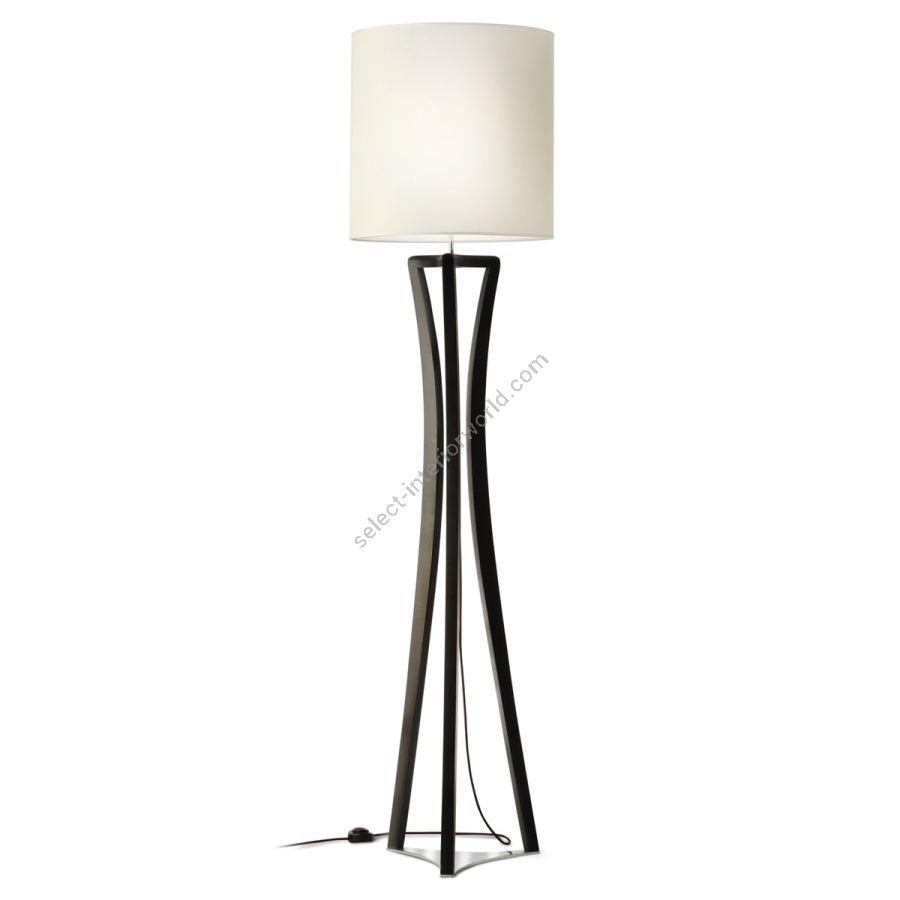 This bright floor lamp, with a wenge-colored decorated wooden structure and chromed metal base, completed with a cylindrical lampshade in ivory fabric, is perfect for lighting a bedroom, a dining room or a living room. Available in various colors.