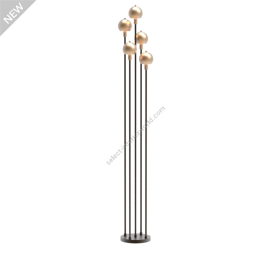 Characterized by five linear stems in bronze-finish brass, complemented by five spherical lampshades in brushed gold-finish brass, the floor lamp can be used in both night and day areas. Available in various finishes.