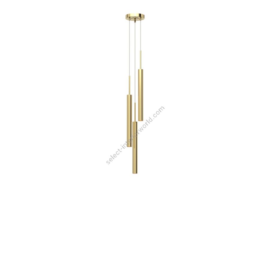 Inspired by a contemporary and sophisticated design, this suspension lamp ideal for bedrooms and living areas is a clear example of aesthetic and practical functionality. Composed of a structure with a round ceiling base and three cylindrical brass pendants, made in the precious light gold finish.