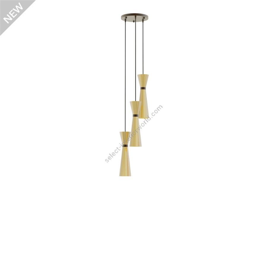 Composed of a base and a structure made in bronze finish, this chandelier is completed by three metal lampshades in the precious brushed gold finish, each formed by two conjoined cones, directed towards opposite directions and at different height levels, capable of giving light both in the part higher than lower. Available in various finishes.
