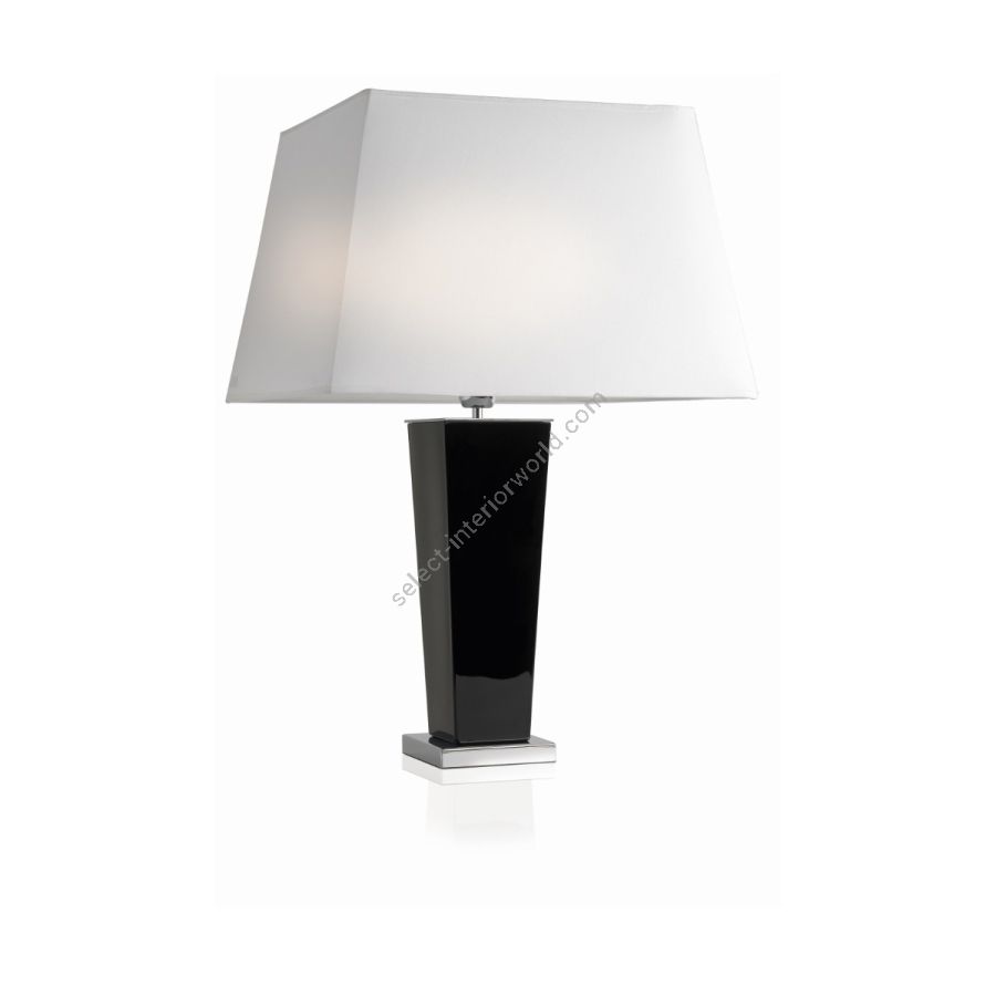 Table lamp with a contemporary style and a design in the shape of a truncated pyramid, with a central body in lacquered wood and details in chrome finish.