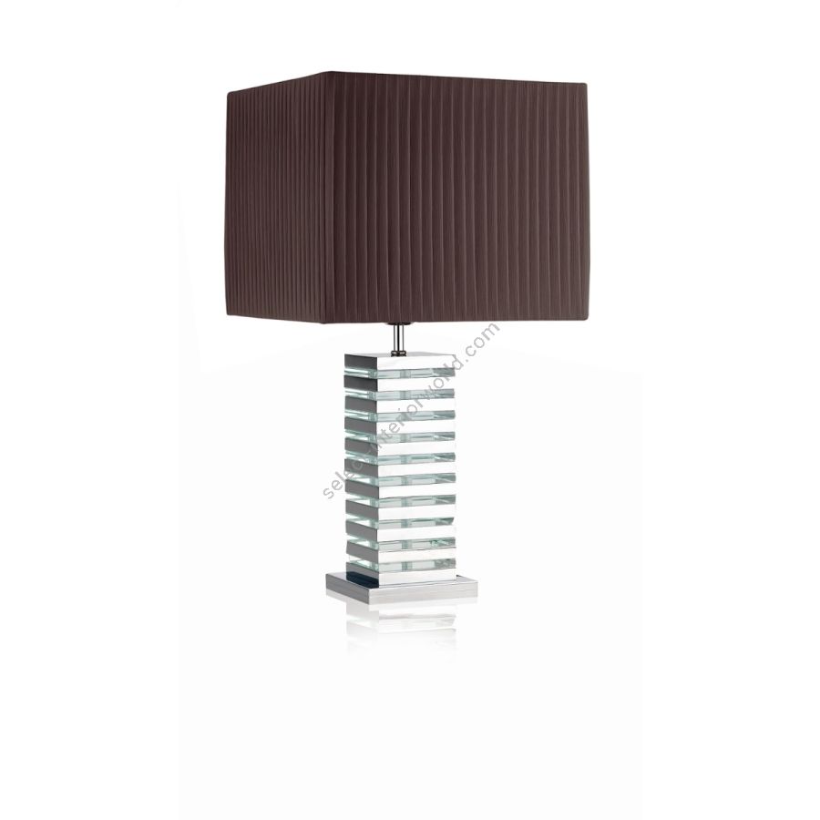 Characterized by an original and timeless design, this chrome-finish metal desk or table lamp combines style and modernity through details in transparent methacrylate and a lampshade in rectangular-shaped brown pleated fabric. Available in polished nickel, polished chrome and light gold finish.