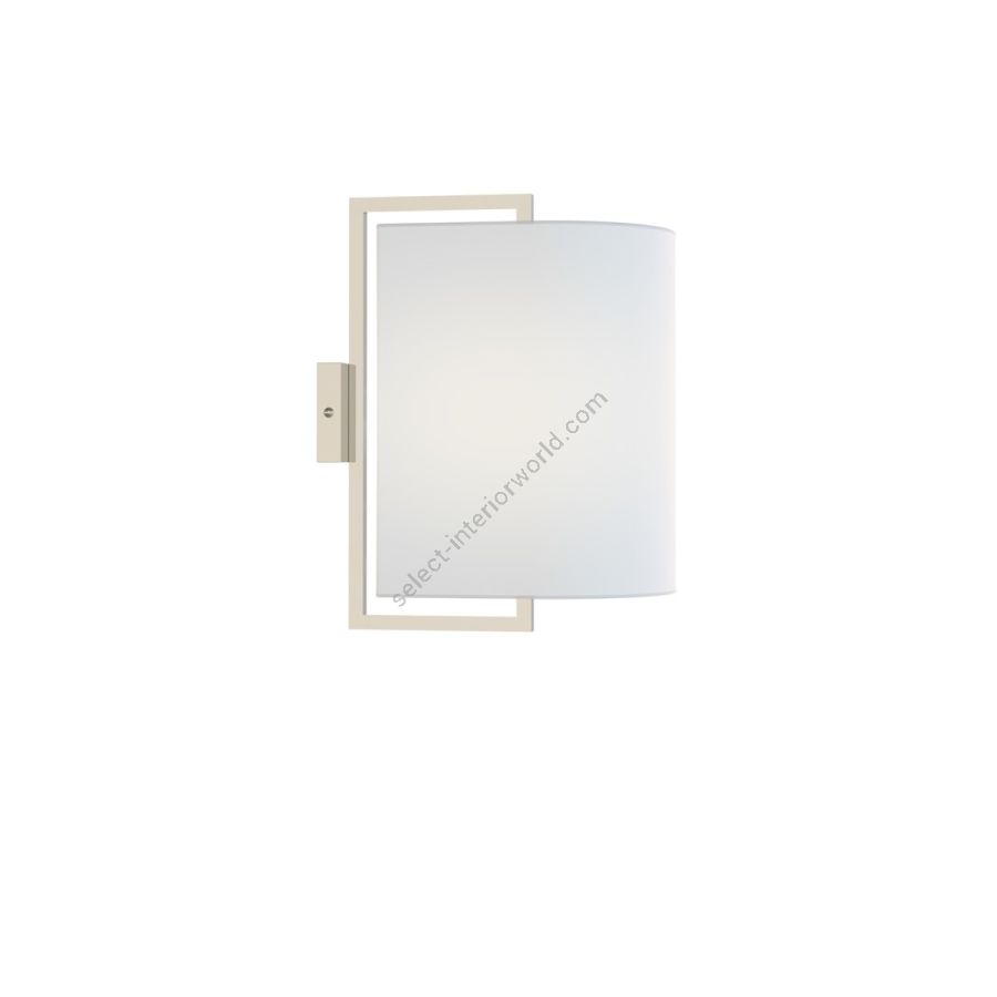 Wall lamp of contemporary and refined design for bedrooms, corridors and common areas, with structure composed of a rectangular frame and fixing base in brass in polished nickel finish. Shade in white fabric. Available in various colors.