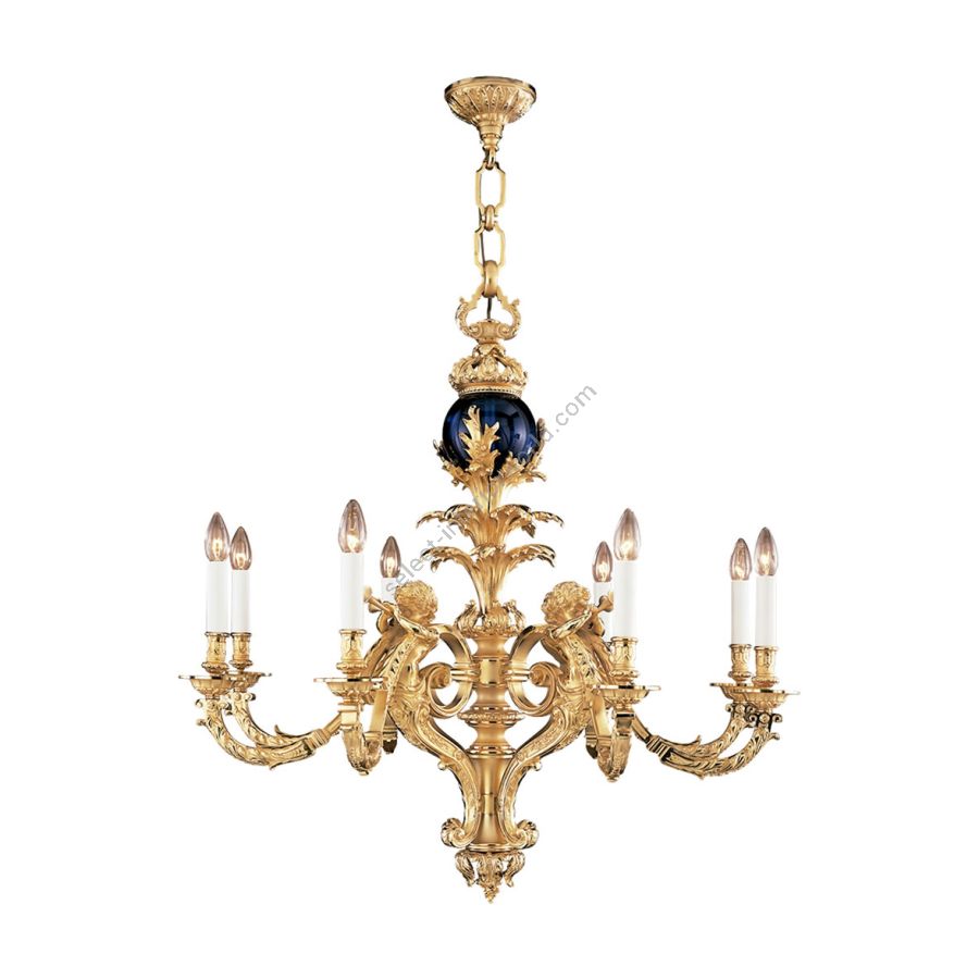 A magnificent Baroque style real gold plated bronze chandelier hand made under the artisan technique of the “lost wax” casting. The chandelier is centered by blue crystal globe surmounted by scrolling foliage, bellow four cherubs blowing a horn. This Baroquem masterpiece is manufactured by Mariner during the last 60 years.