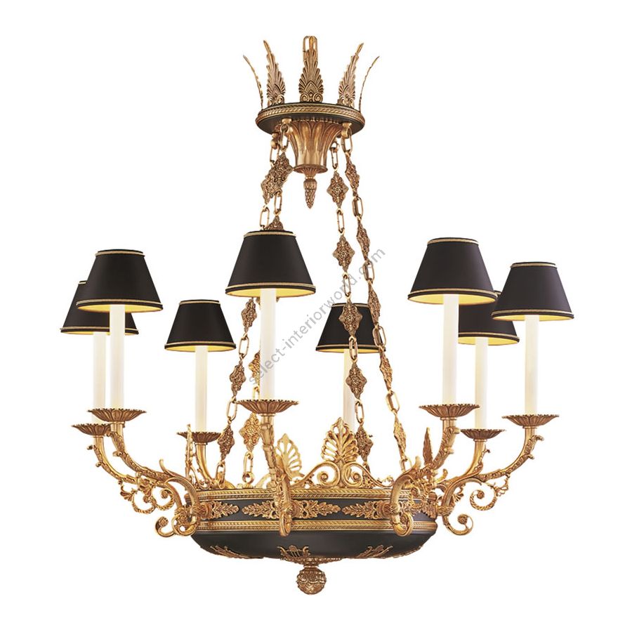 A fine quality eight branch bronze and gilt empire chandelier created by Mariner in the midle of the XX century and reintroduced into our catalogue in 2002. Marked by clear Egyptian decorative influence with a bronze crown of an thermion from wich is suspended a chain of bronze elements. The main dish itself is surmounted by a bronze tazza an is decorated with acantus leaf in high relief.