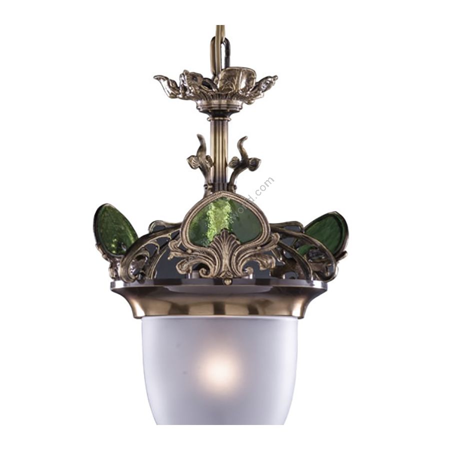 Pendant lamp is made of antique brass finish and glass.