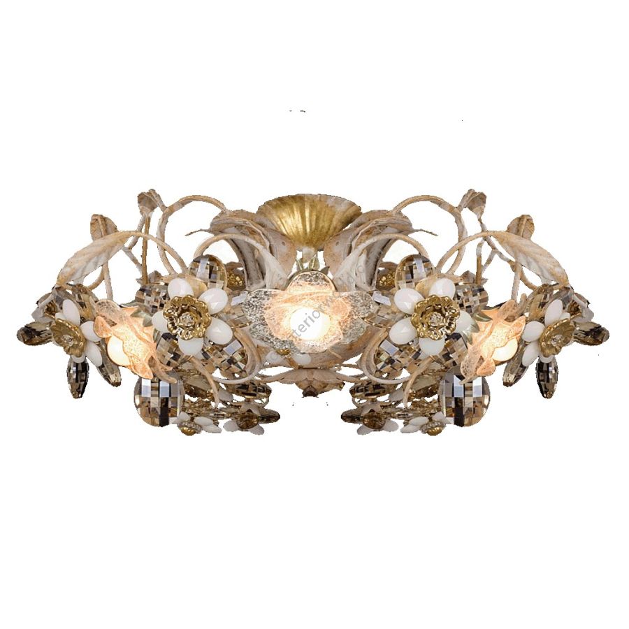 4 lights ceiling lamp in wrought iron with coloured Bohemian crystal and coloured pearl banding
