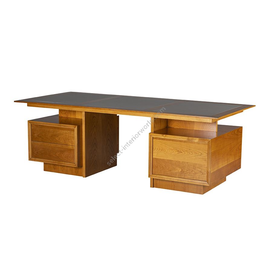 Double sided writing desk with two base parts containing larg modules with door and drawers. Top with precious leather insert.