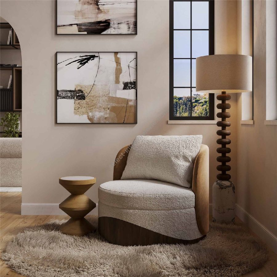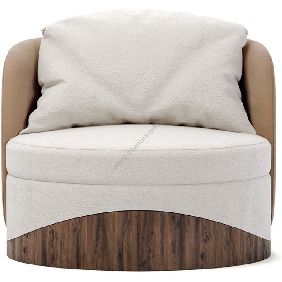 The Balli Armchair features a sumptuous cream fabric that envelops its soft, round seat, inviting you to relax in its embrace. The chair’s back and sides are covered in a warm beige fabric, adding depth and a touch of elegance to its modern silhouette. The distinctive base is crafted from rich walnut wood, with a wavy design that echoes the chair’s curves and adds a natural element to its aesthetic.